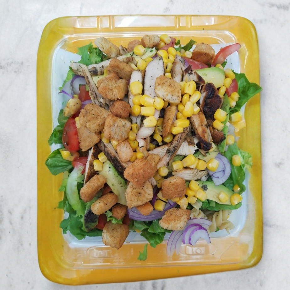 Mezcla de lechuga, pasta Fusilli, tomate, elote, aguacate,cebolla morada, pollo asado, crutones, aderezo.