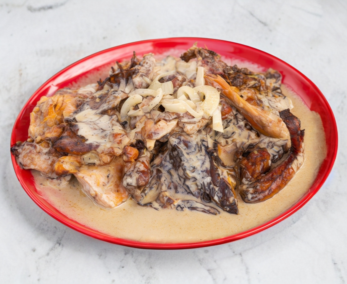 Pollo asado a leña bañado en una salsa de cremosa de cuatro quesos (incluye arroz, tortilla).