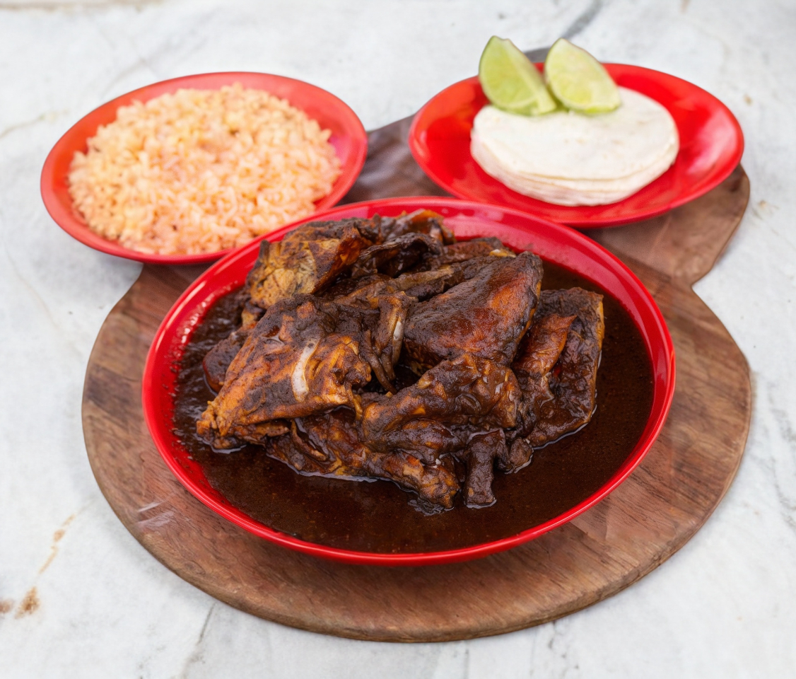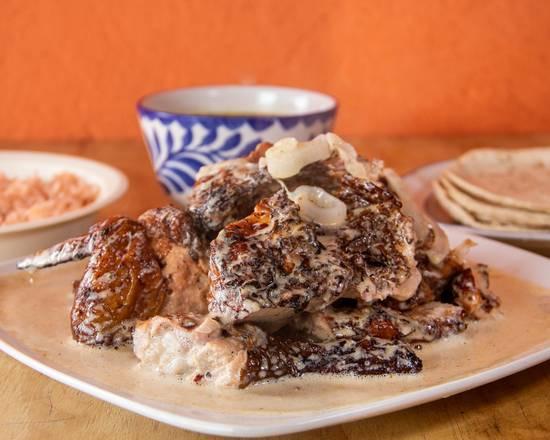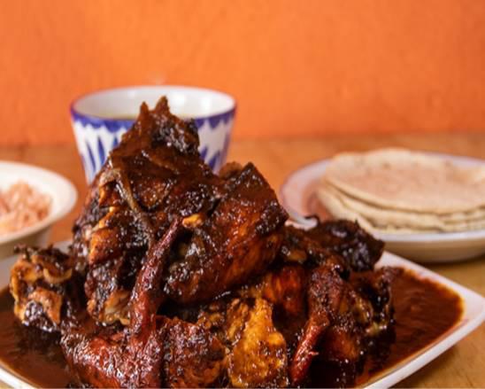 1/2 Pollo asado a a leña bañado en una salsa cremosa de chilpaya; picante moderado (incluye arroz, tortilla y salsa chilpaya).