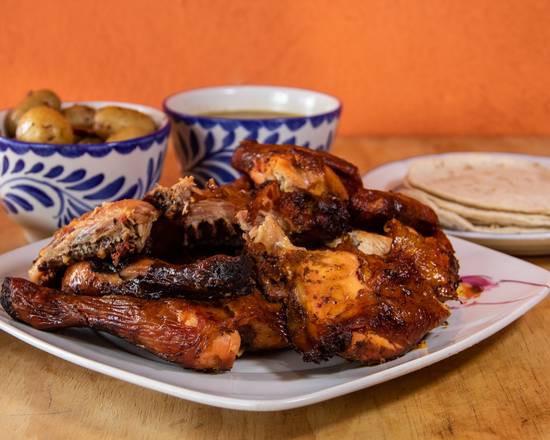1/2 Pollo asado a leña bañado de una salsa de chipotle; picante moderado y un toque dulce. (Incluye arroz, tortilla y salsa chipotle).