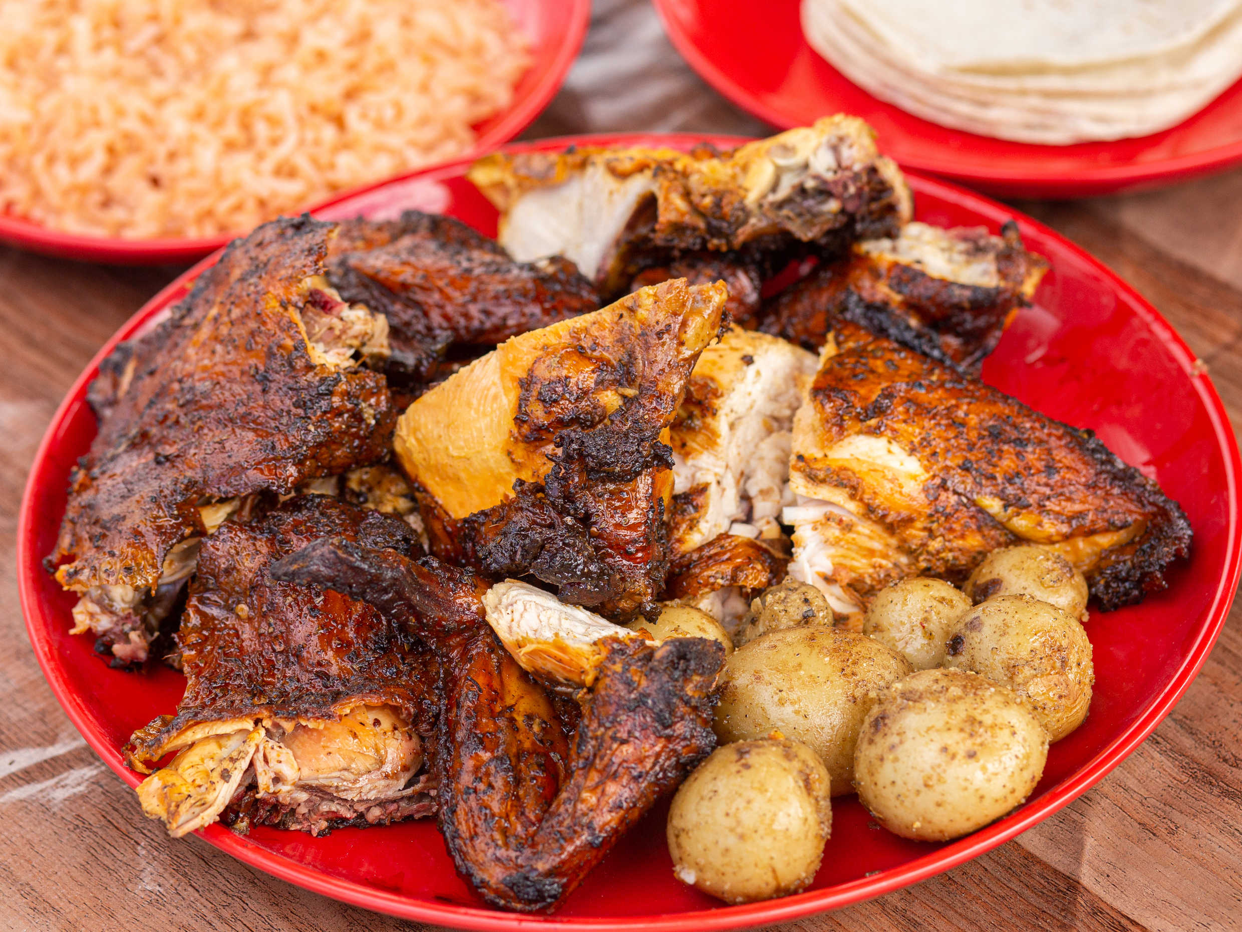 Pollo asado a leña bañado de una salsa de chipotle; picante moderado y un toque dulce (incluye arroz, tortilla y salsa chipotle).