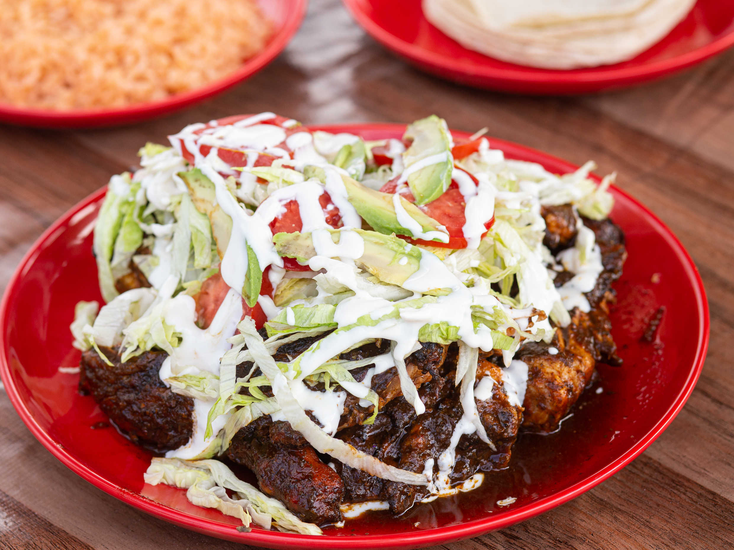 Pollo asado a leña, bañado de una salsa de chipotle y acompañado de tomate, aguacate, lechuga y crema encima. (Incluye arroz, tortilla y salsa chipotle).