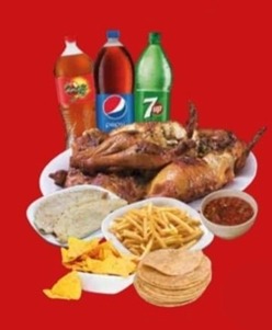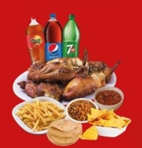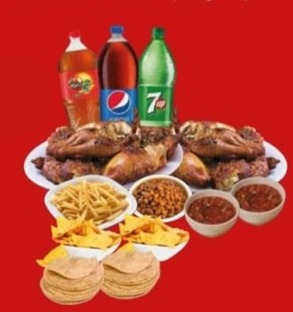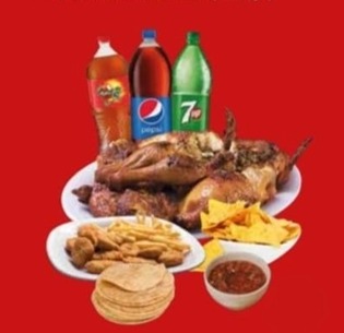Jugosa combinación de 2 pollos enteros asados al carbón, acompañado de 1 porción de frijoles charros, una porción de papas francesas (200 g) 2 bolsita de salsa cruda, 2 bolsita de cebolla morada, 2 bolsita de totopos, 300 g de tortillas (2) y 1 refresco de 2 L.