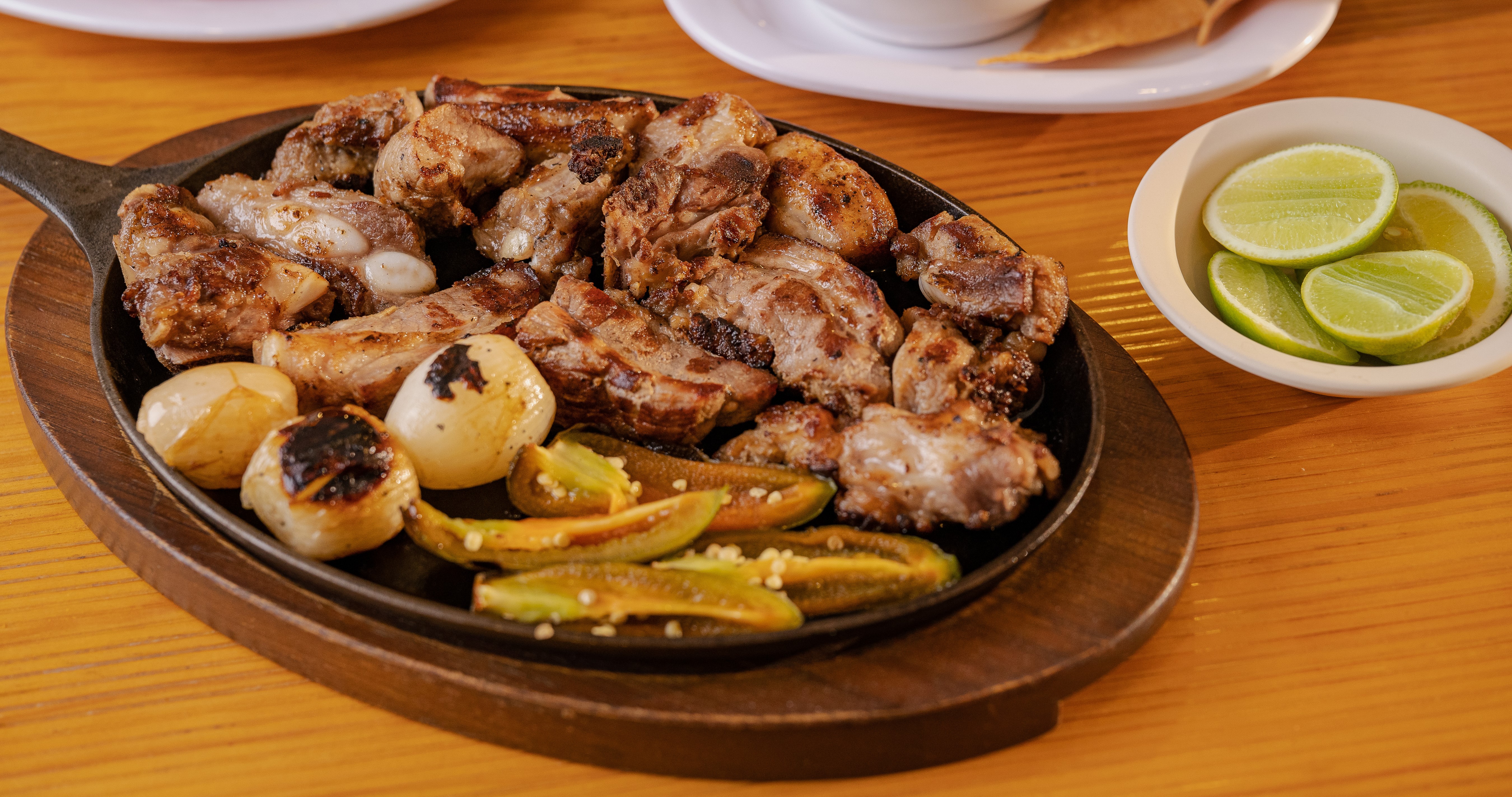 ¡Saborea!! costillas de cerdo, con huesito, asadas al carbón. acompañada de cebollines y chile asado.