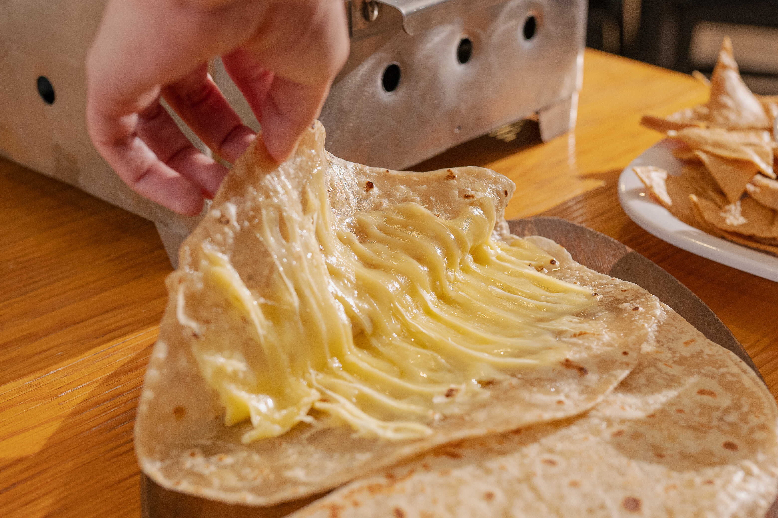 Tortilla de harina rellena de queso gouda (50 g), al comal.