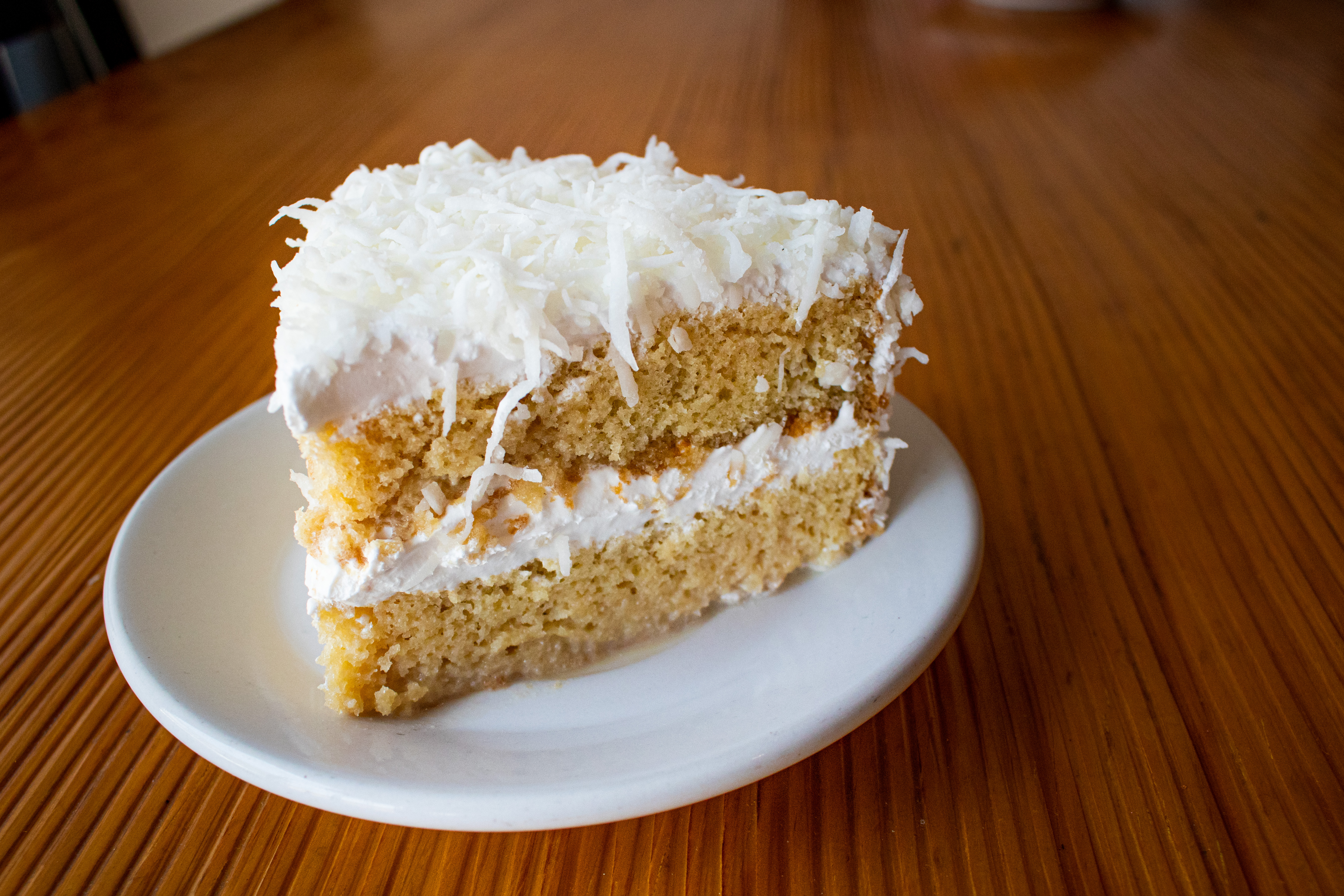 Rebanada de pastel , 3 leches con cobertura de coco rallado.