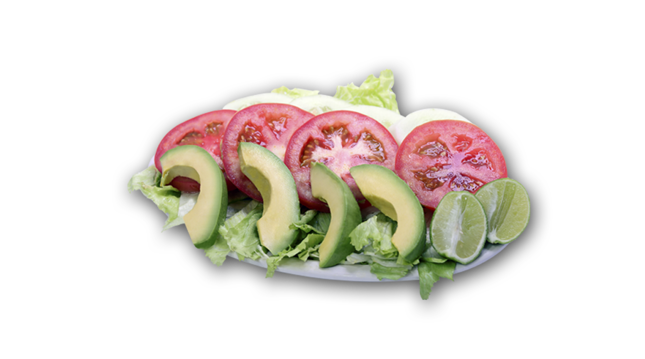 Rica ensalada realizada con lechuga, pepino, tomate acompañada de aderezo de la casa y limones.
