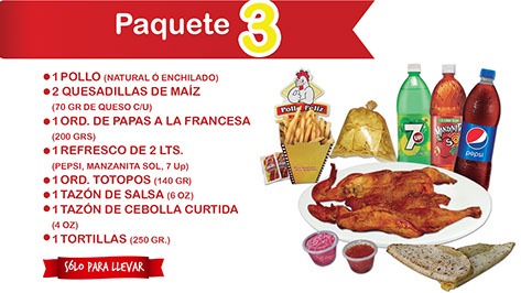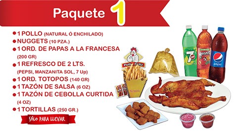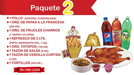 2 Pollos natural o enchilado, 2 ordenes de totopos, 2 tazones de salsa, 2 tazones de cebolla, 2 paquetes de tortilla de máquina 250 g, 1 orden de papas a la francesa, 1 refresco 2 L.