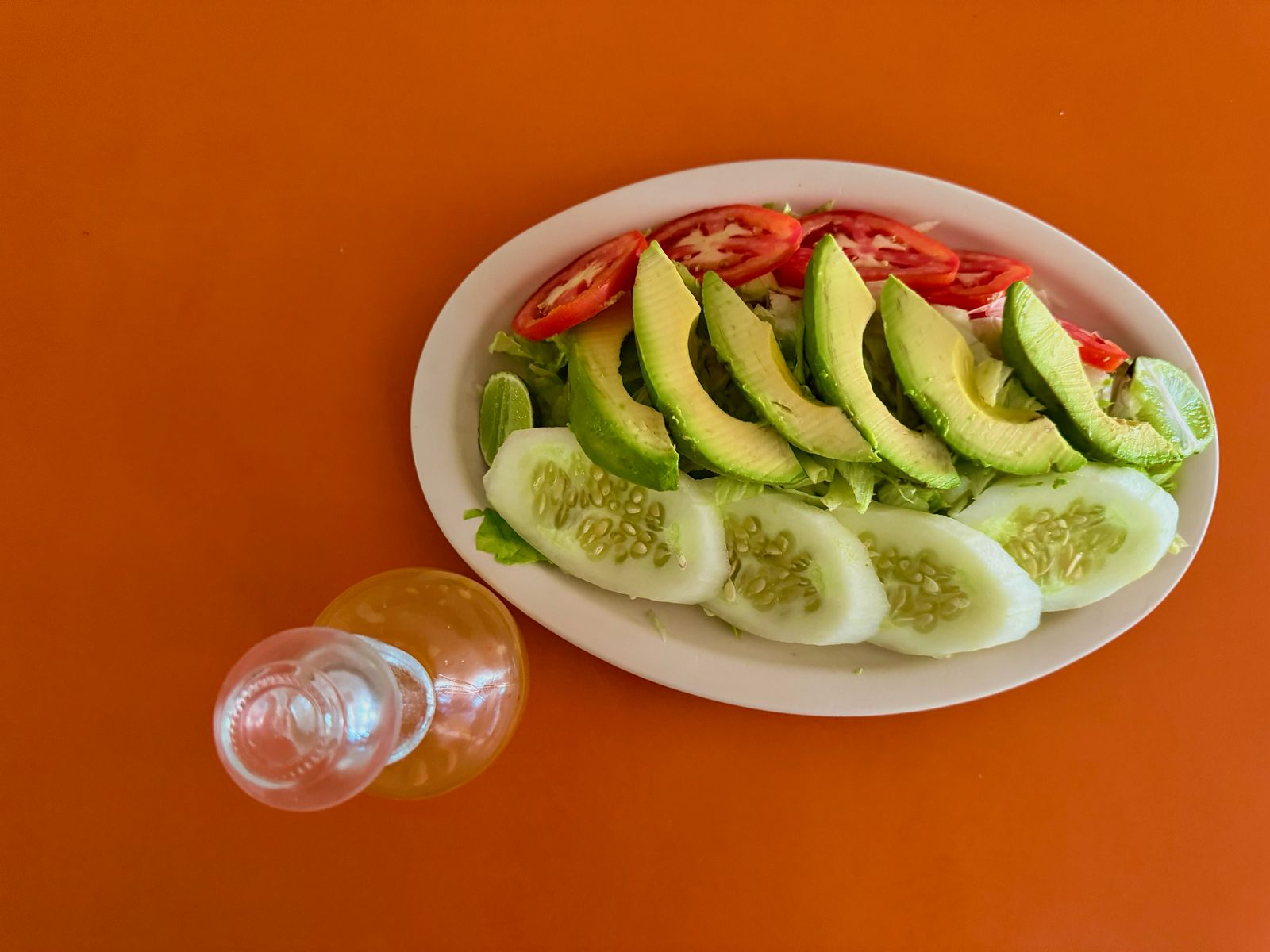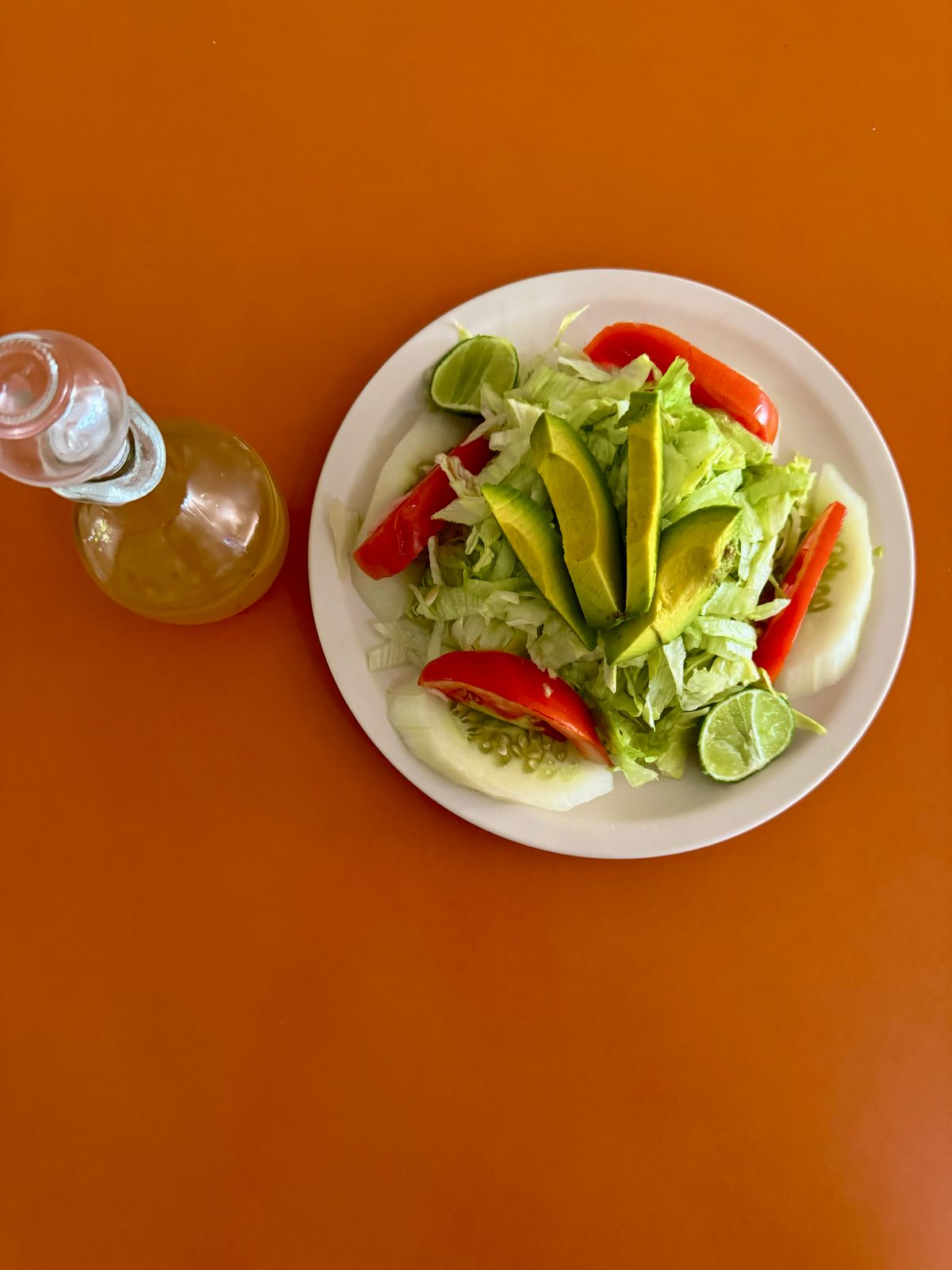 Ensalada chica de lechuga con pepino, jitomate, aguacate y limón.
