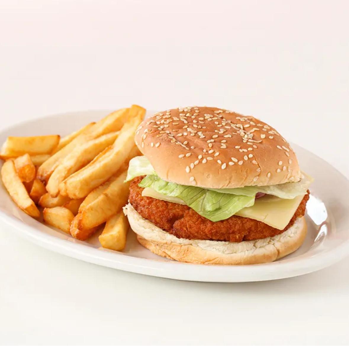 Hamburguesa de pollo, con lechuga, jitomate, queso amarillo, cebolla, mostaza y 100 g de papas a la francesa.