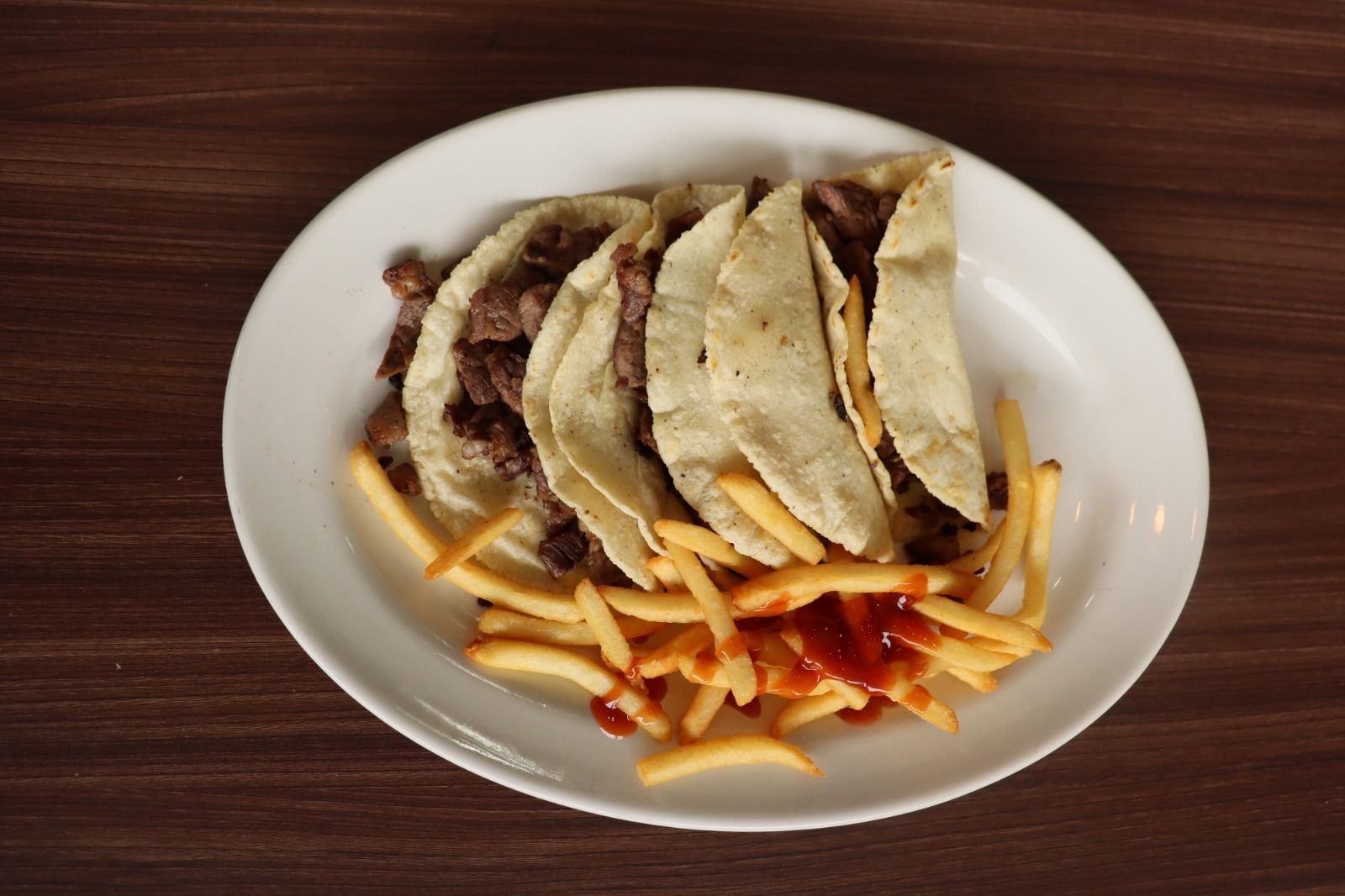 250 g De carne, 4 tacos de harina y 100 g de papitas.