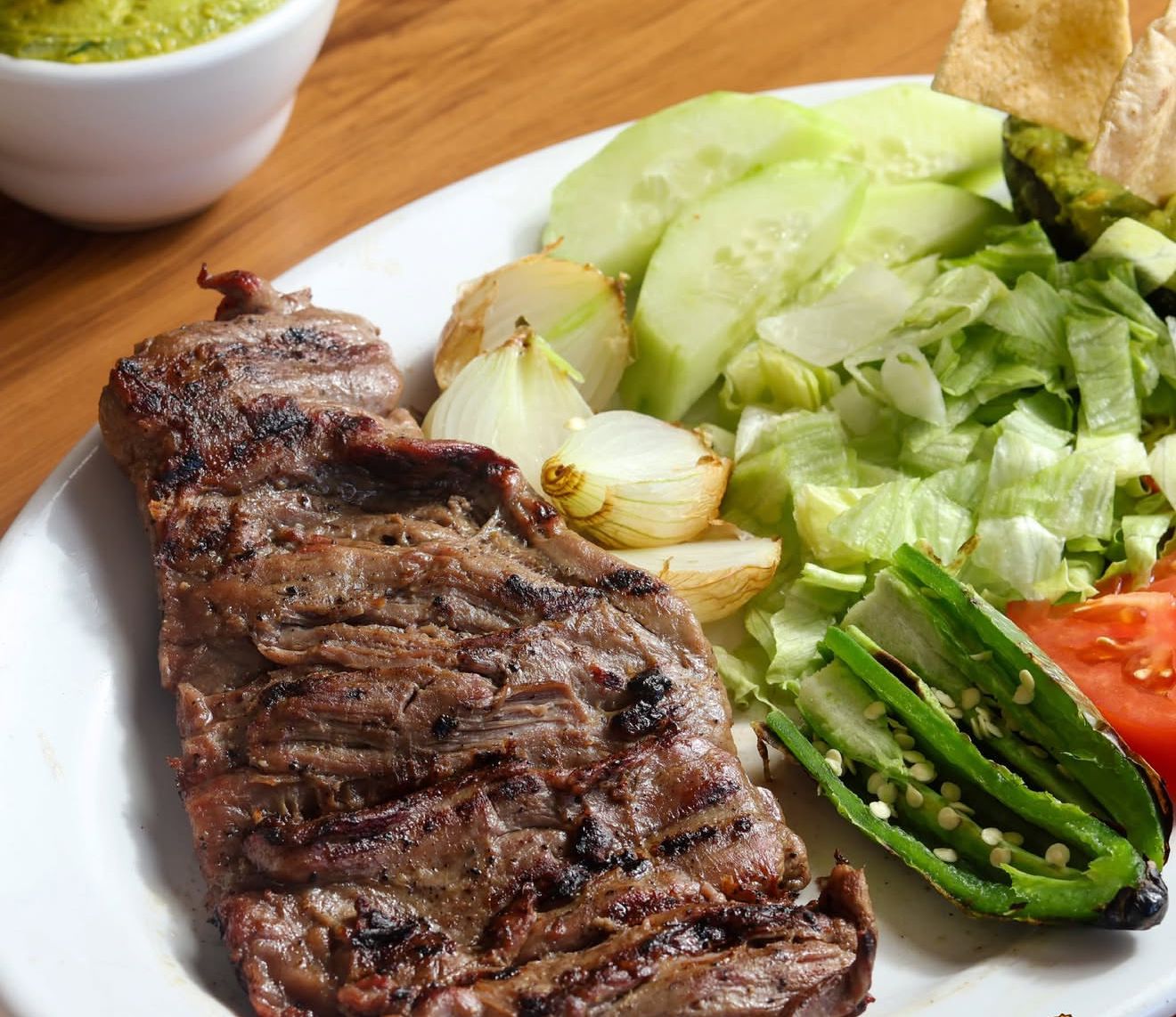 Tazón de frijoles charros, 300 g de carne, guacamole, cebollina, chiles asados, ensalada de lechuga con pepino y jitomate y tortillas a mano.