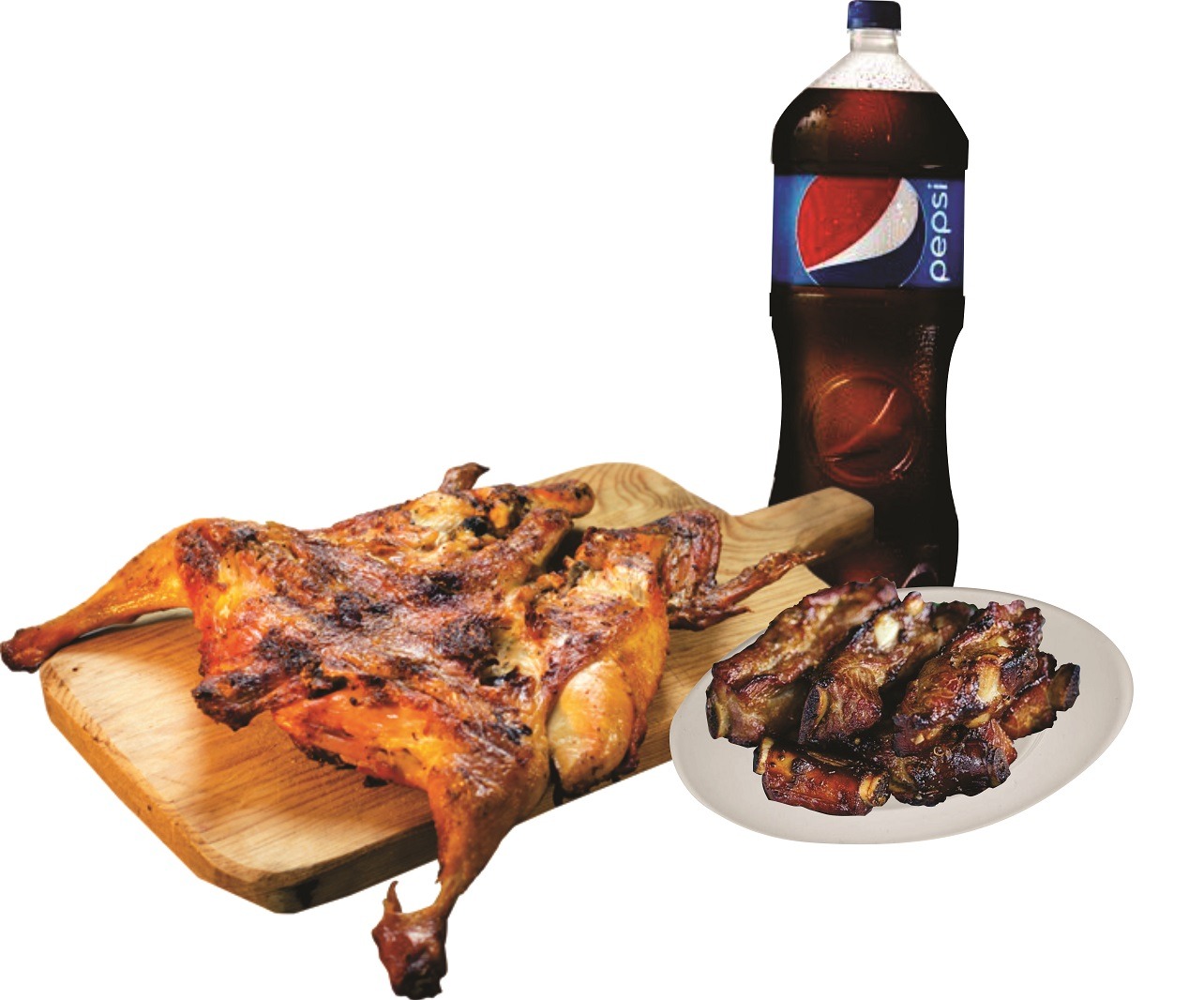 1 pollo a la leña, costilla 1/2kg, nopales/rabanos, 1 refresco de 2 lts (pepsi, manzanita sol, 7up, mirinda), salsa, cebolla asada, chiles curtidos, chile asado, totopos, tortillas