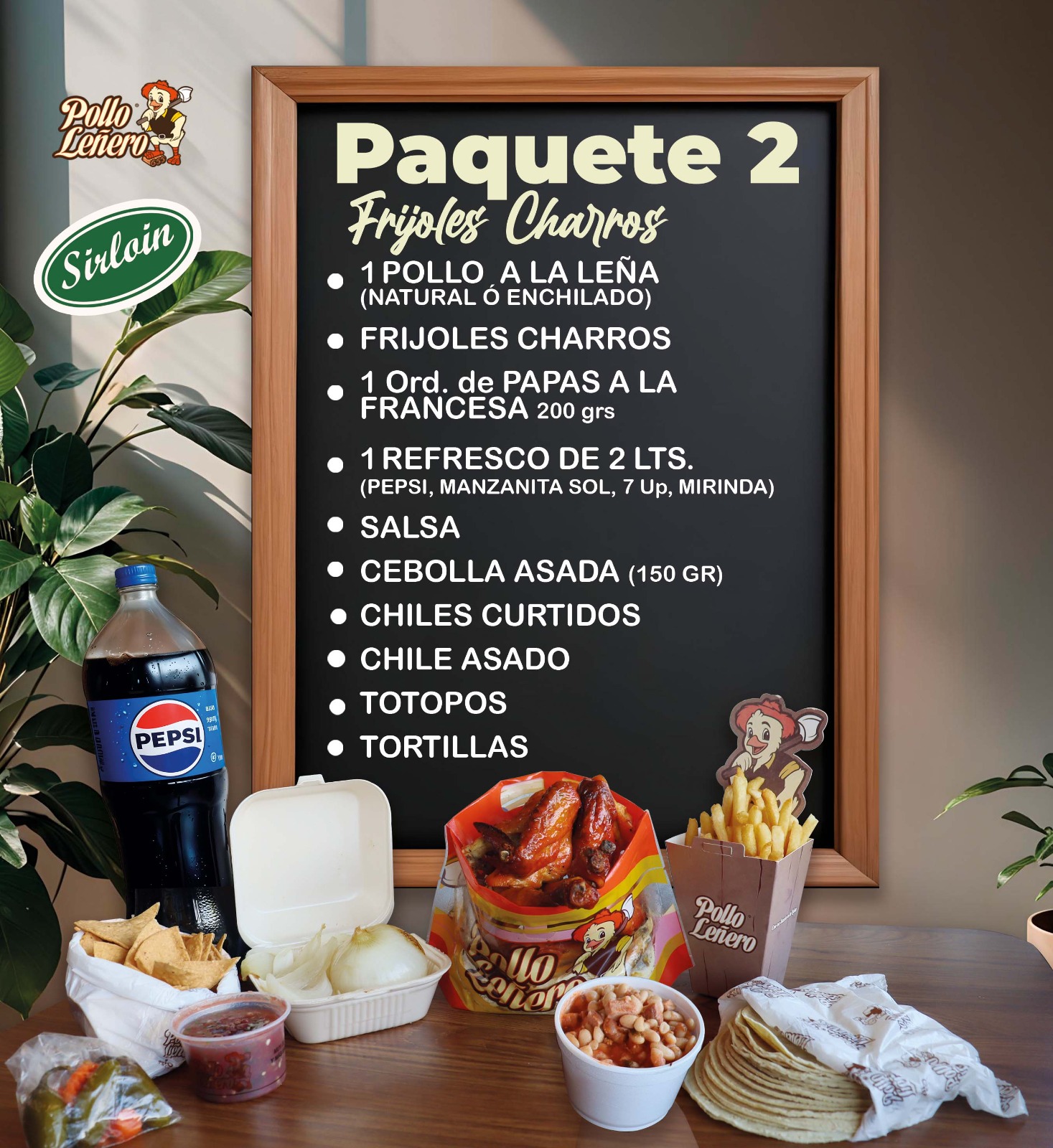 1 pollo a la leña, frijoles charros, 1 ord de papas a la francesa (200gr), 1 refresco de 2 lts (pepsi, manzanita sol, 7up, mirinda), salsa, cebolla asada, chiles curtidos, chile asado, totopos, tortillas