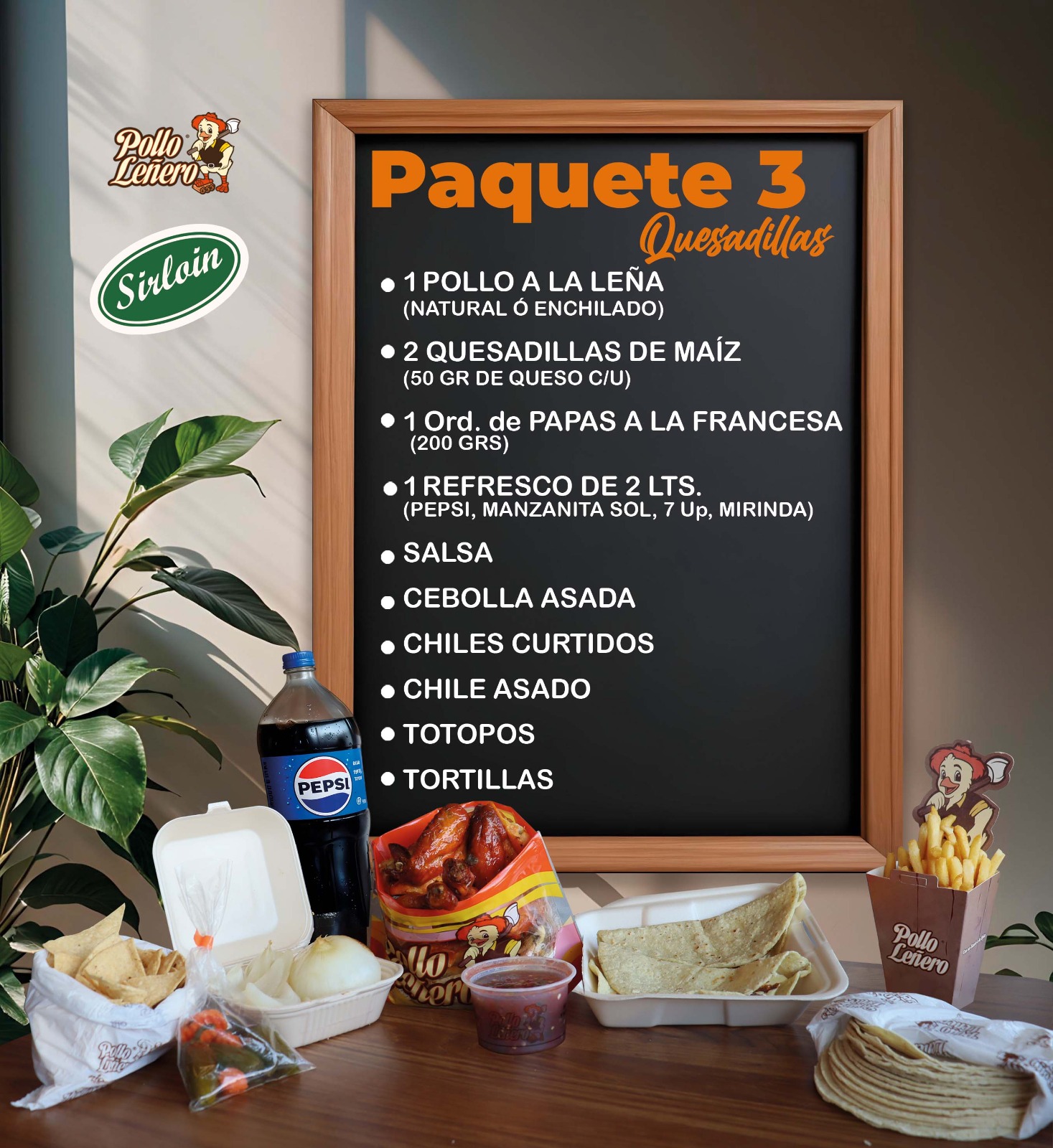 1 pollo a la leña, 2 quesadillas de maiz (50gr de queso c/u), 1 ord de papas a la francesa (200gr), 1 refresco de 2 lts (pepsi, manzanita sol, 7up, mirinda), salsa, cebolla asada, chiles curtidos, chile asado, totopos, tortillas