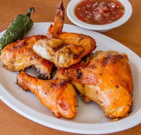 1 medio pollo, acompañado con cebolla asada, tortillas, chiles en vinagre y salsa roja