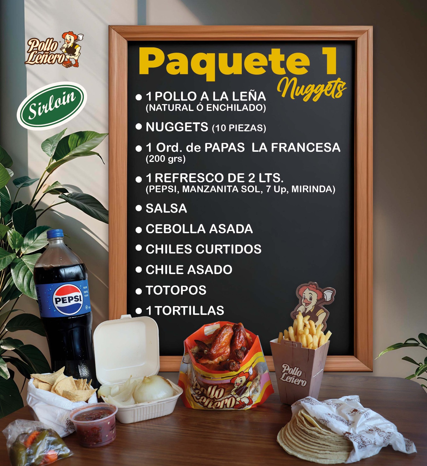 1 pollo a la leña, nuggets (10pz), 1 ord de papas a la francesa (200gr), 1 refresco de 2 lts (pepsi, manzanita sol, 7up, mirinda), salsa, cebolla asada, chiles curtidos, chile asado, totopos, tortillas