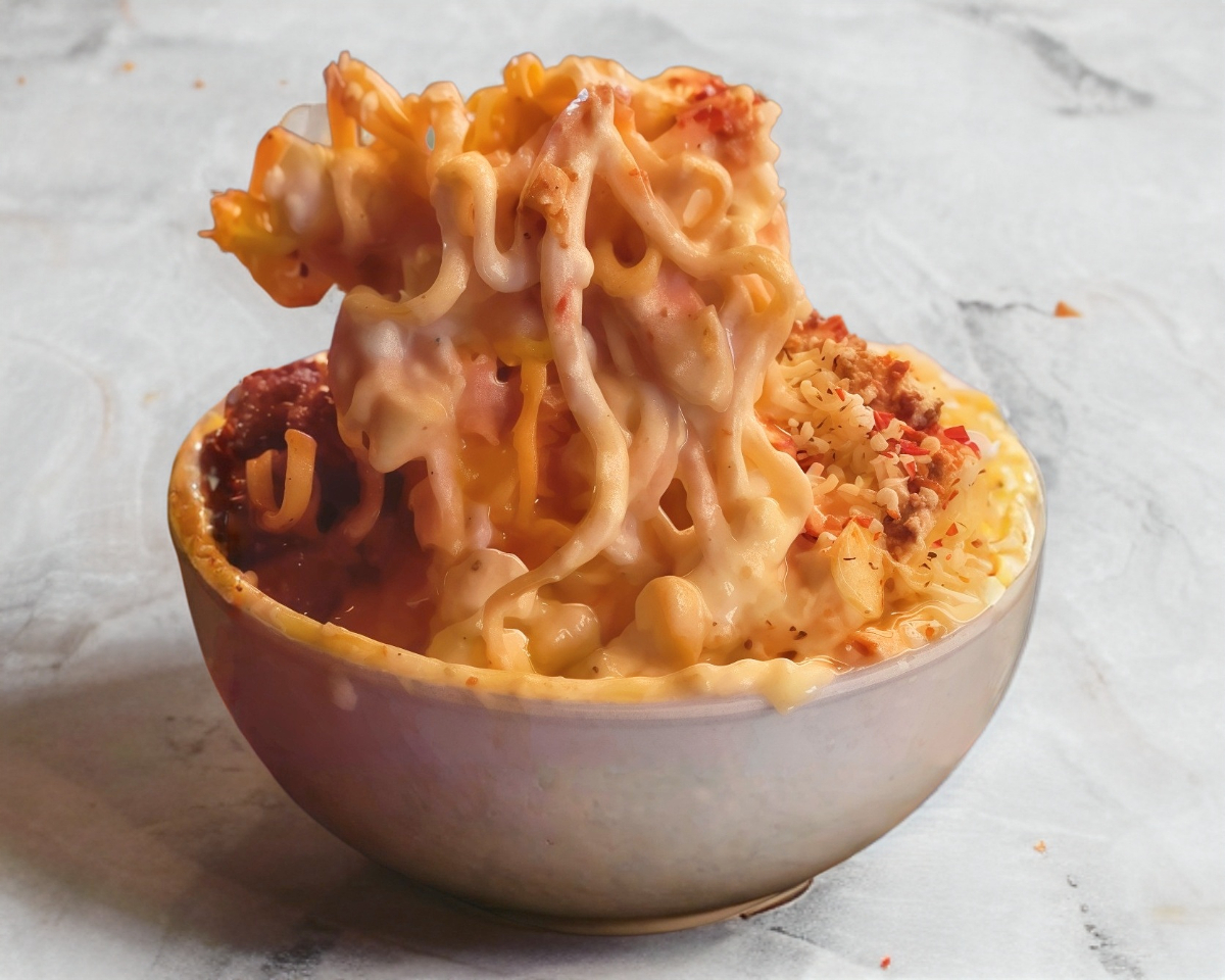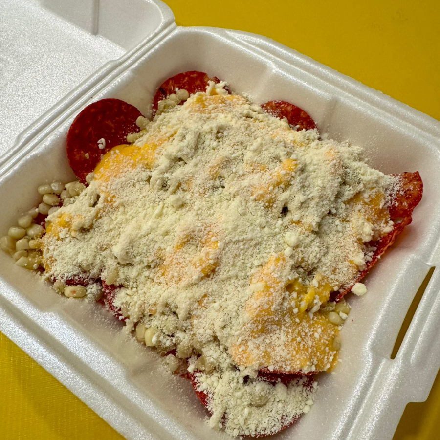 Frituras con esquite, mayonesa, crema, quesito y cheddar derretido.