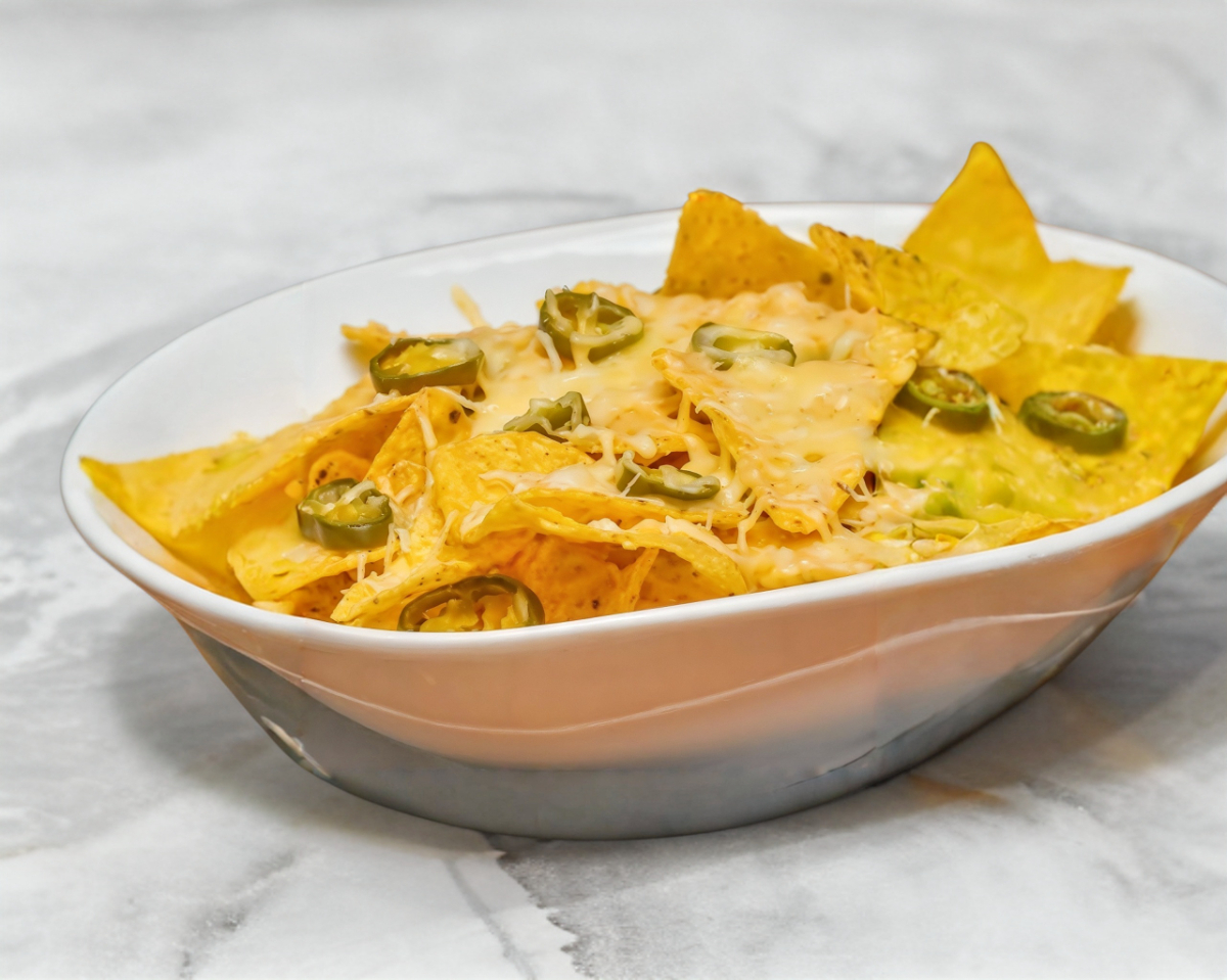 Los tradicionales nachos cubiertos de quesito cheddar, cotija y jalapeños.