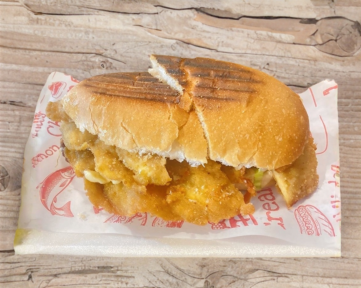 Torta de milanesa pollo, preparada con tomate, frijoles, aguacate y mayonesa.