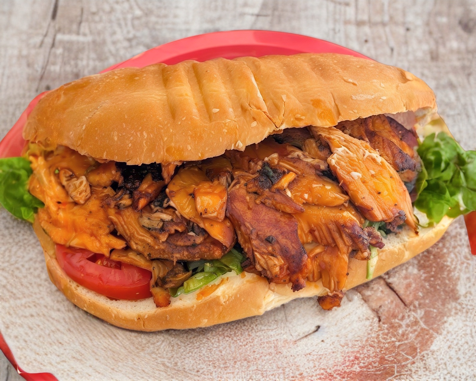 Torta de pierna horneada preparada con lechuga, tomate, frijoles refritos y aguacate.