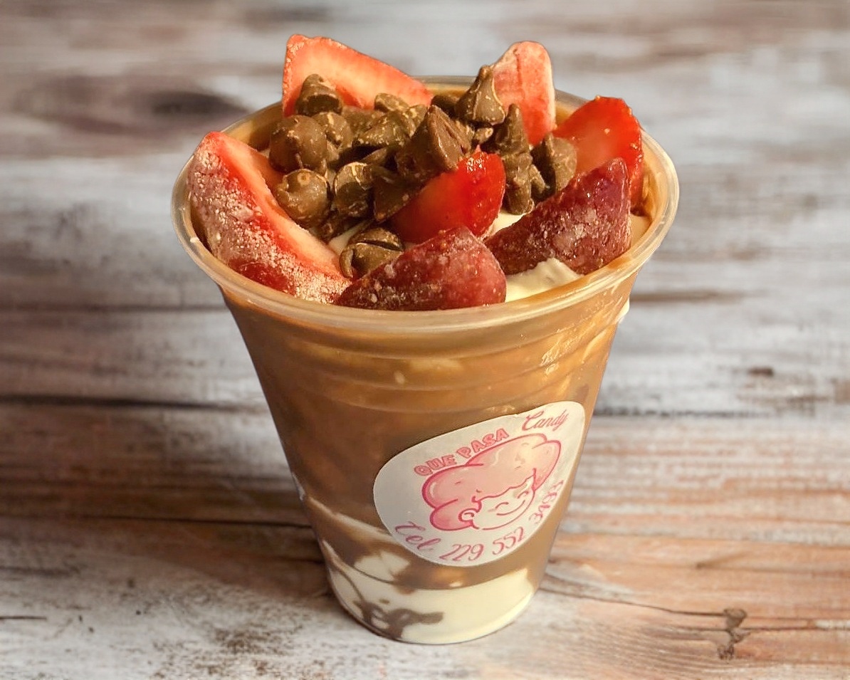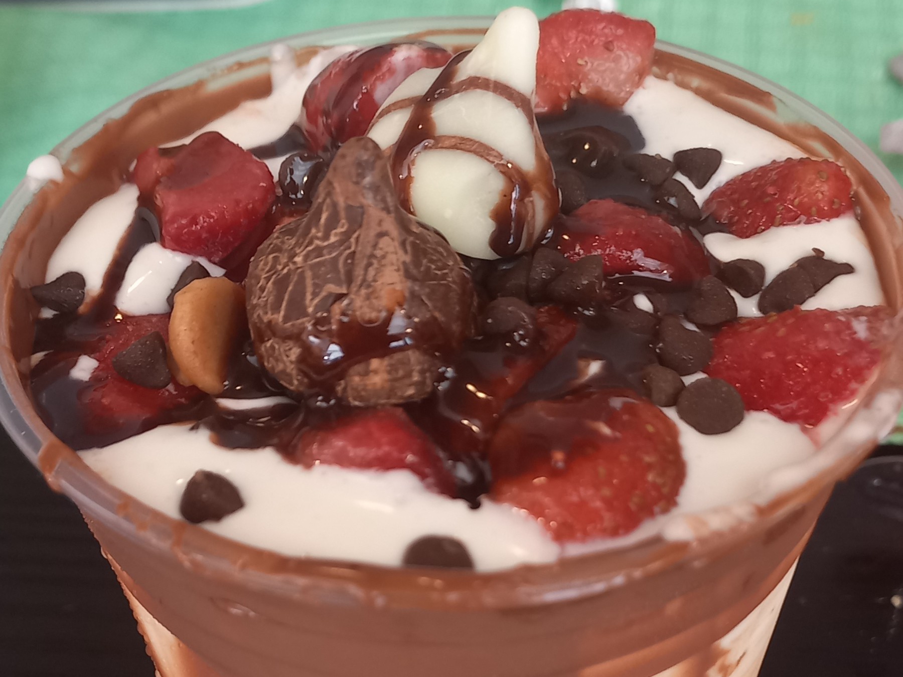 Vaso de aprox. 16 oz de fresas con 355 ml de crema, Nutella y un topping de Hershey’s.