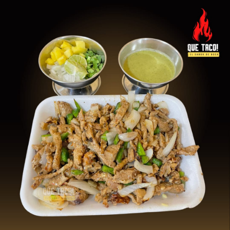 Orden 350g de carne de cerdo estilo asada, enmarinada con salsas gourmet, salsa inglesa, chile verde, cebolla asada y queso gratinado. Acompañado de 15 tortillas 100% de maiz, cebolla, cilantro, limones, salsa verde.