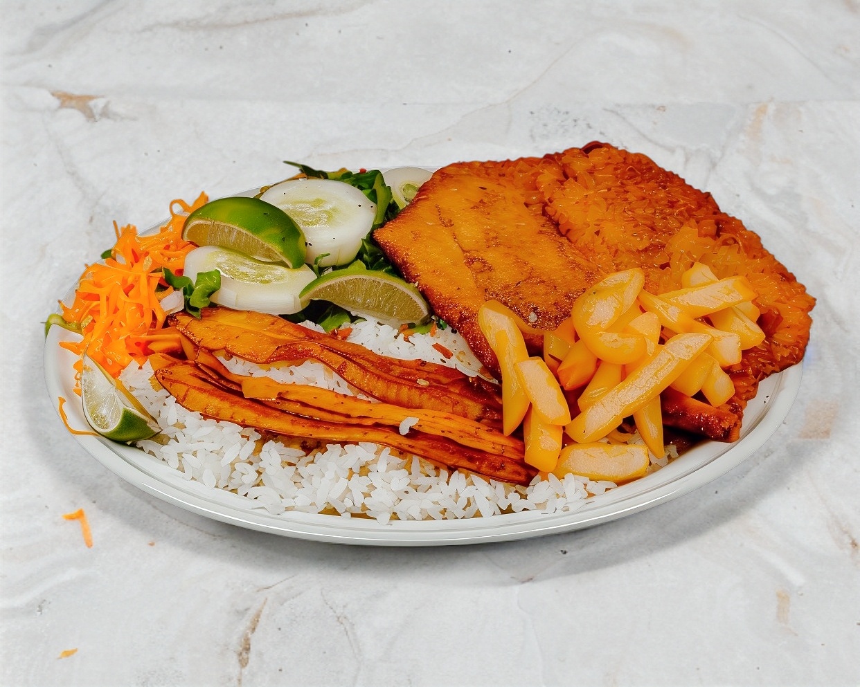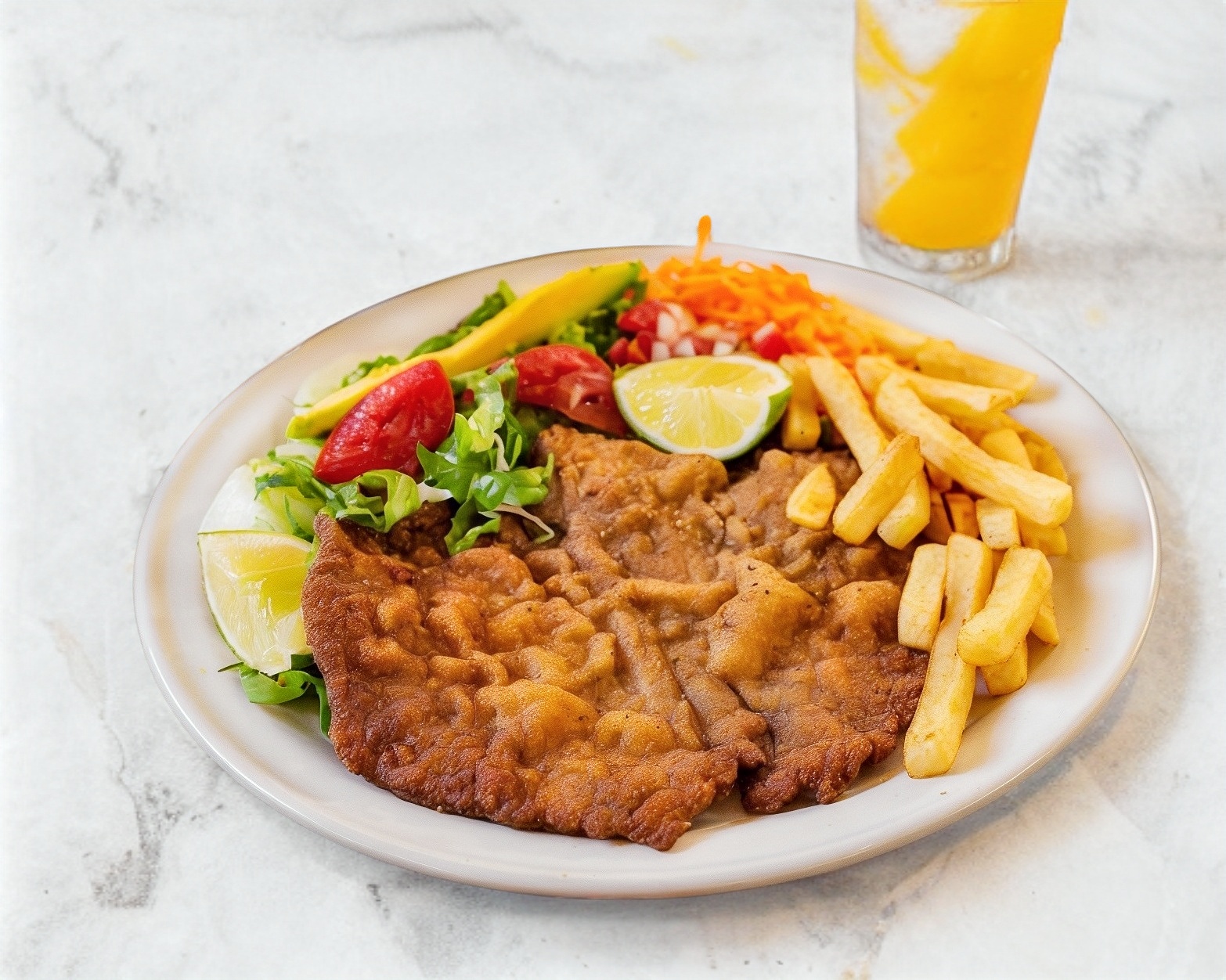 Exquisita milanesa de res empanizada, se le quita el exceso de grasa. (Elige tu guarnición favorita: arroz/ensalada/frijoles refritos, incluye agua natural del día 1/2 Lt y tortillas)
