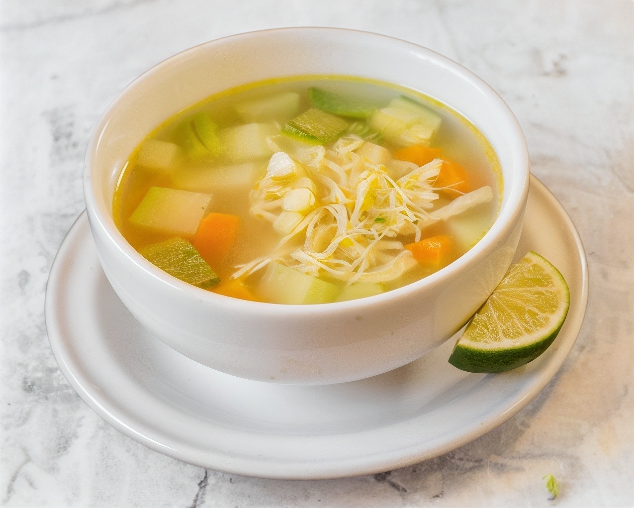 Delicioso consomé de chayote, calabacitas y zanahoria, acompañado con arroz y pollo. (Incluye tortillas y limón)