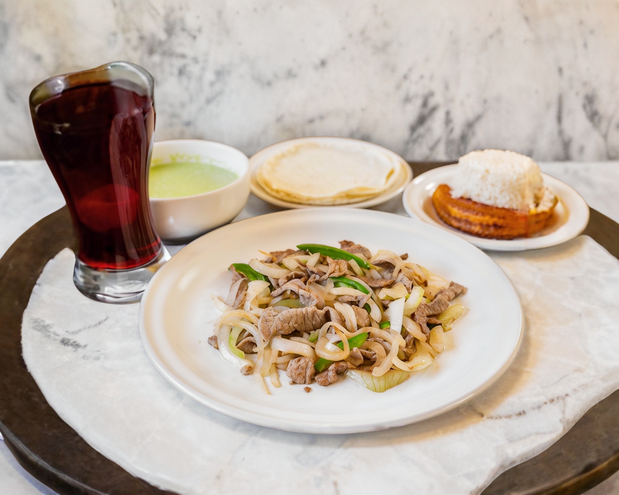 Exquisita res asada en tiras con ligeros pedazos de cebolla pasada ligeramente por el sartén. (Elige tu guarnición favorita: arroz/ensalada/frijoles refritos, incluye agua natural del día 1/2 Lt y tortillas)