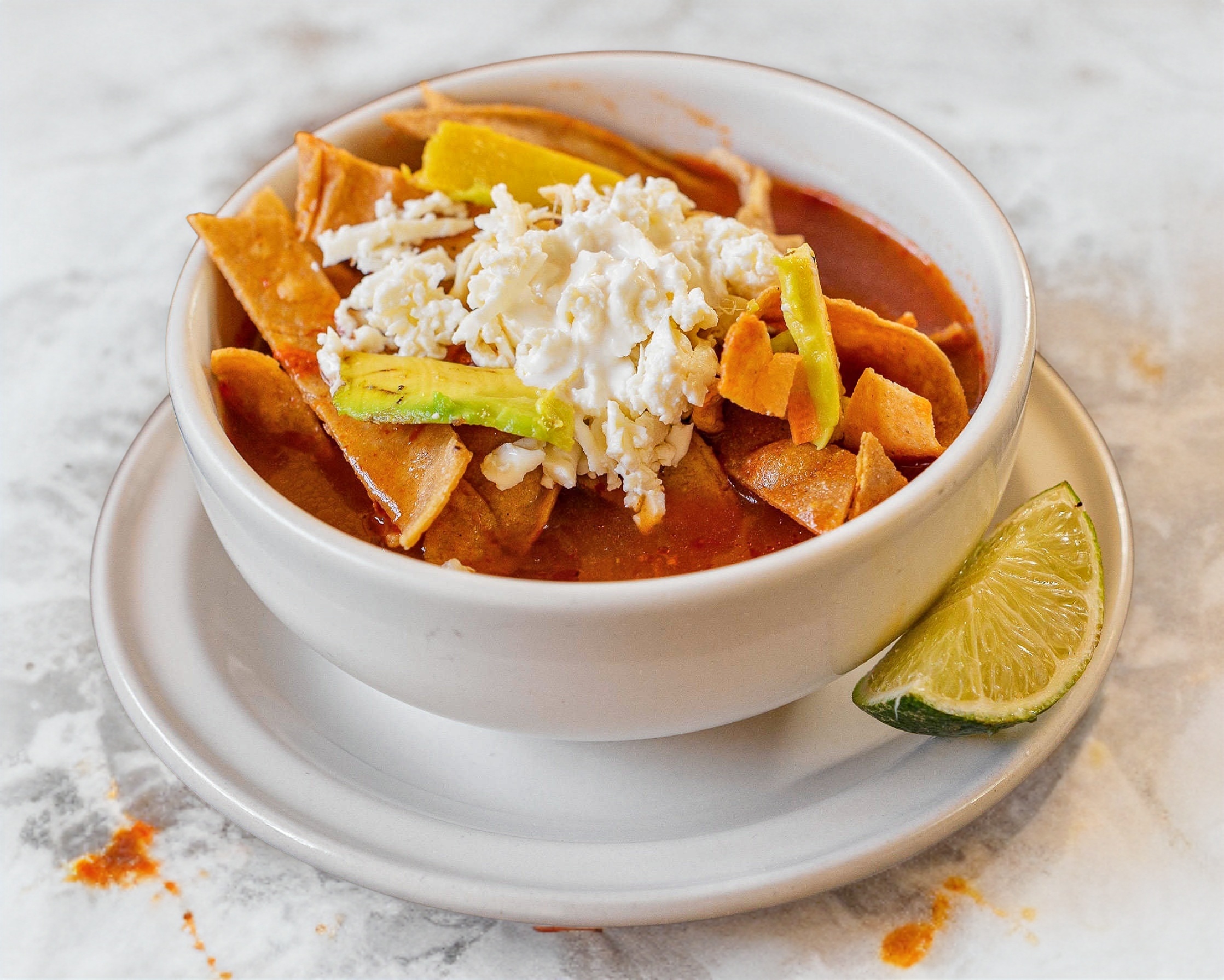 Exquisita sopa de tortilla acompañada de crema, queso y pollo. (Incluye tortillas y limón)