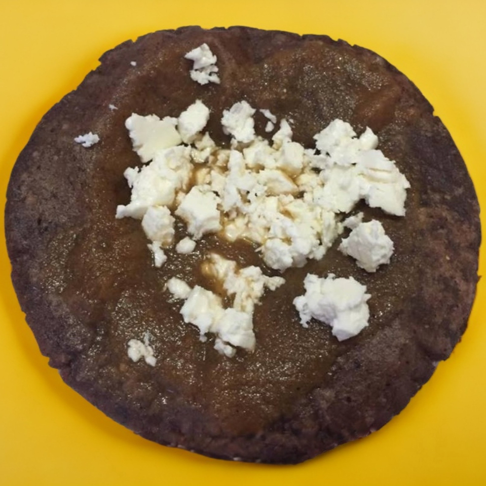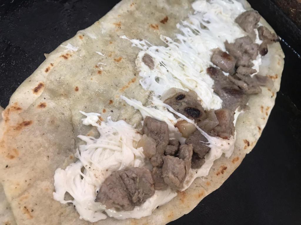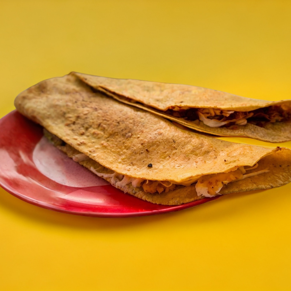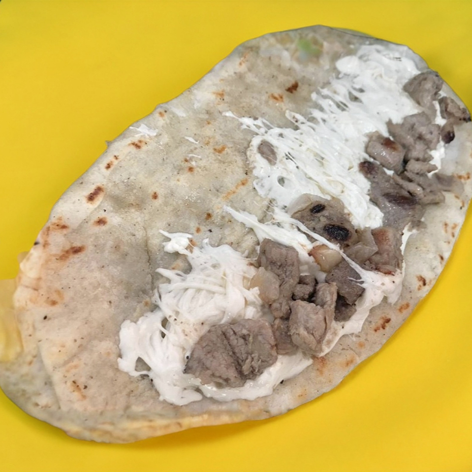Tortilla de maíz de 30 cm con queso de hebra más proteína: bistec, pibil, longaniza, champiñón, flor de calabaza, chicharrón en salsa roja, pollo, picadillo (una a elegir).