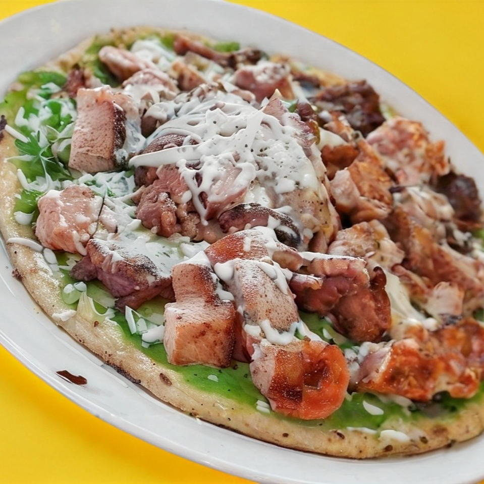 Picada enorme con longaniza bistec chicharrón y huevo, salsa a elegir.