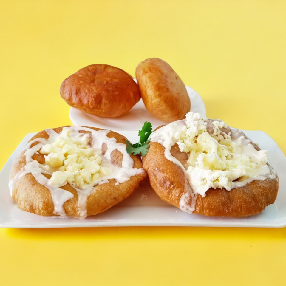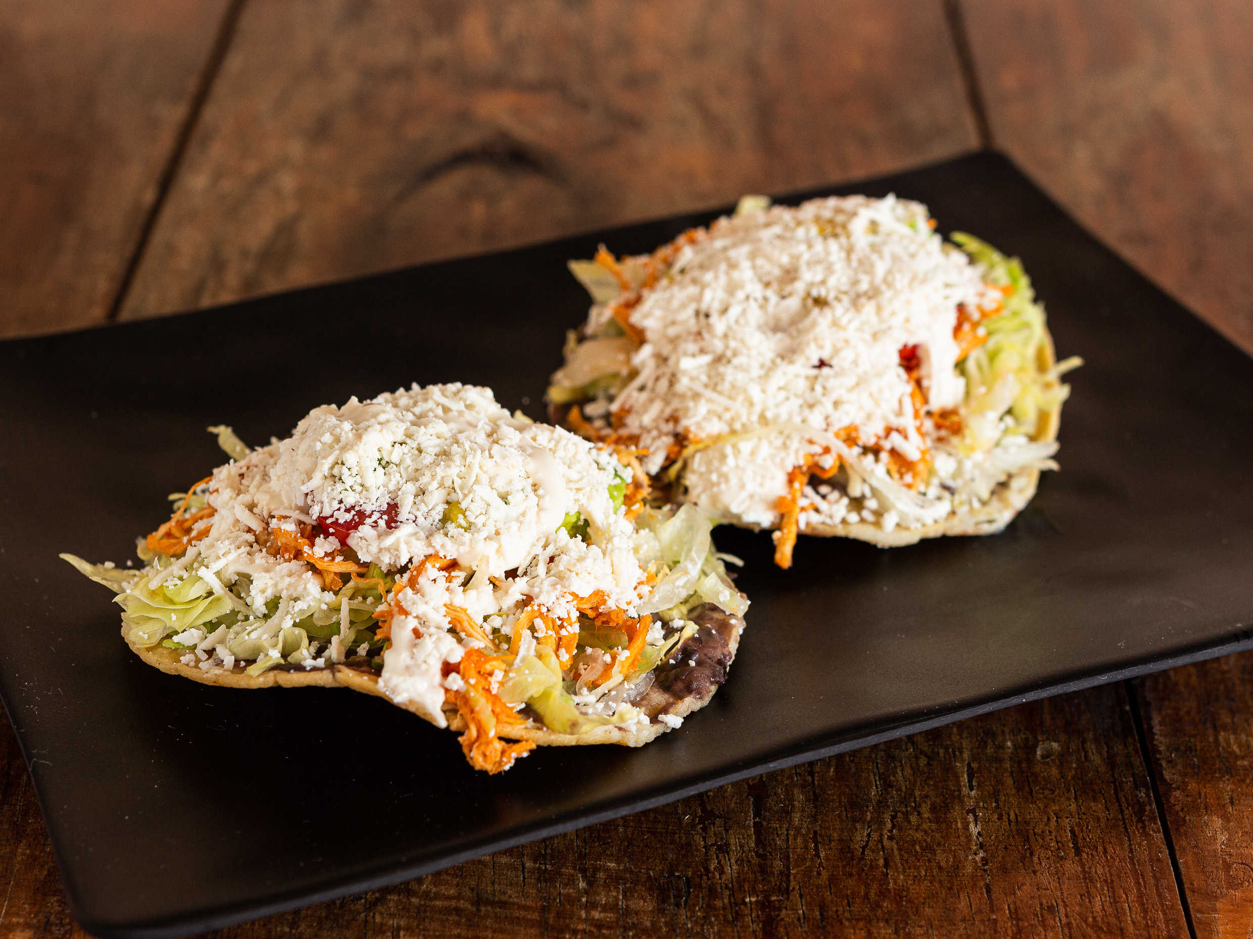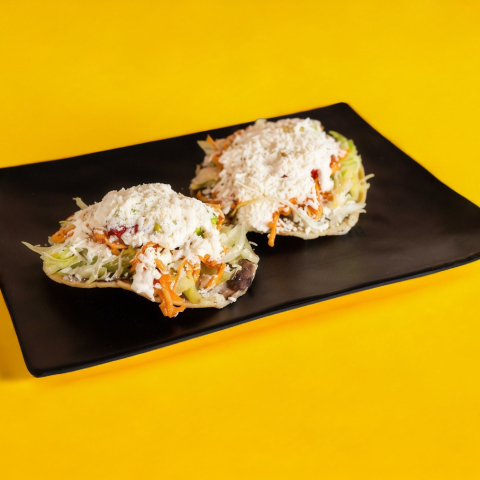 Tortilla frita con una base de frijol, lechuga y tomate, aguacate, crema y queso, salsa de elección: tomate, ranchera, verde, chipotle, habanera.