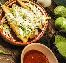 Tortillas fritas rellenas de pollo, acompañado con lechuga, cebolla, crema, queso, aguacate, salsa a elegir: tomate, verde, ranchera, chipotle, habanera 5 pzs.