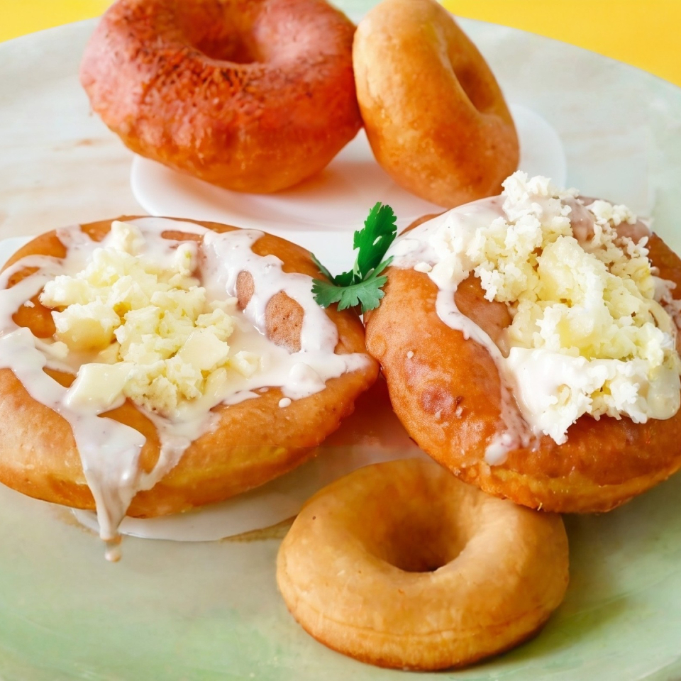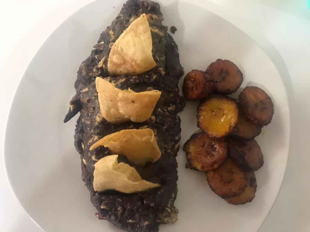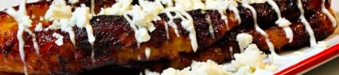 Plátano frito bañado con crema y queso.