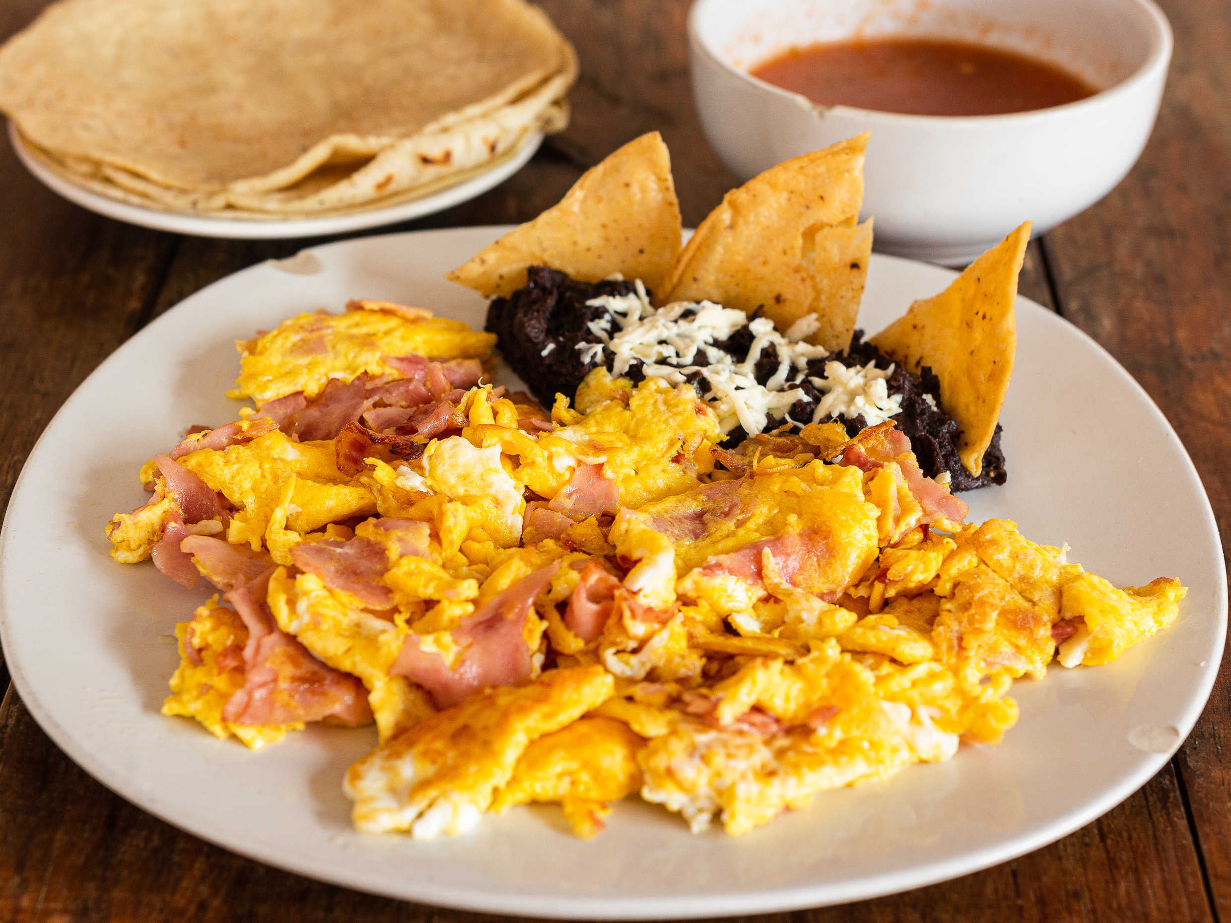 Huevos revueltos (2pz) con frijol refrito y chile seco, acompañados de rodajas de plátano frito, totopos y orden de tortillas a mano (4pz).