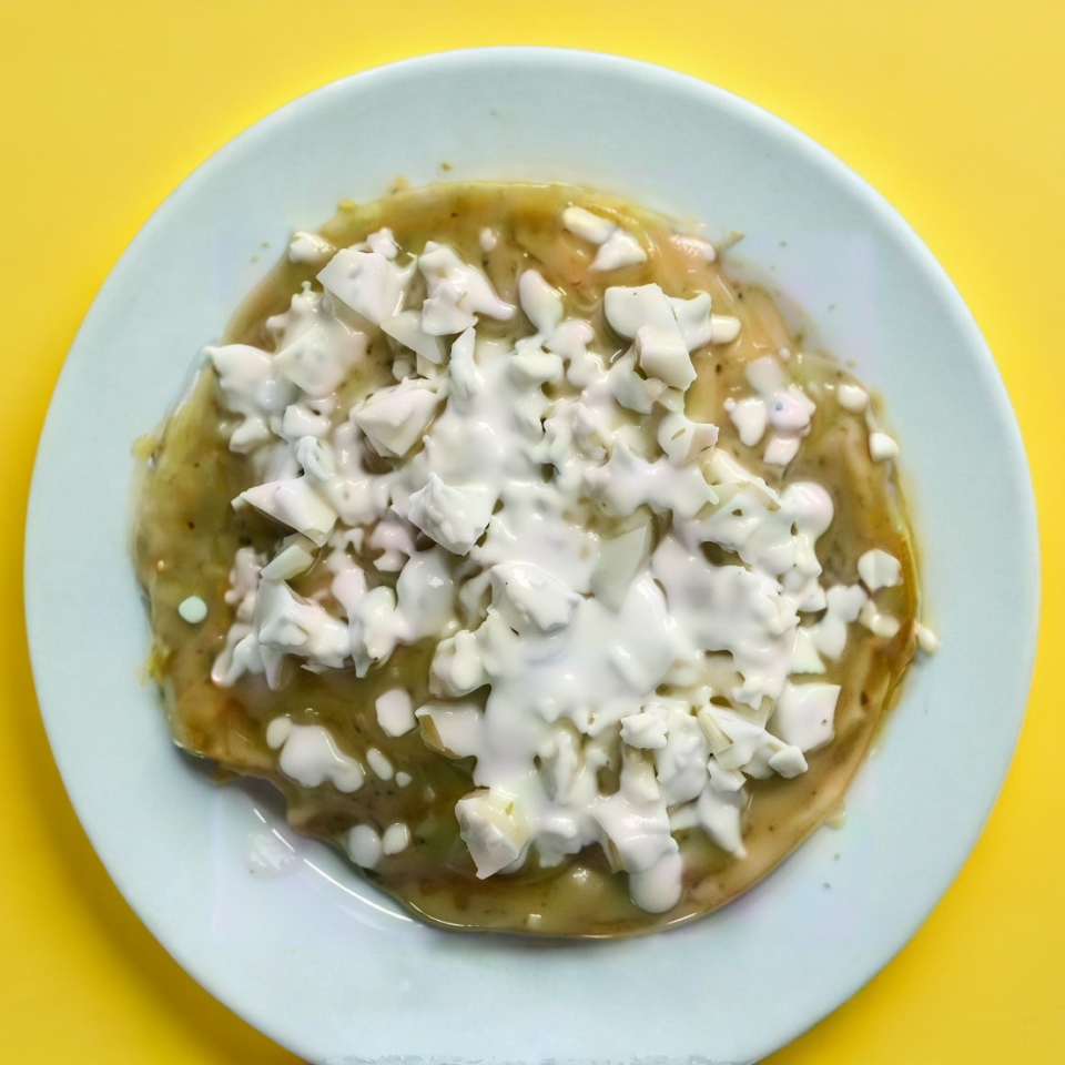 Tortilla bañada de salsa tomate con cebolla, crema, queso y aguacate, o mole, con cebolla queso.