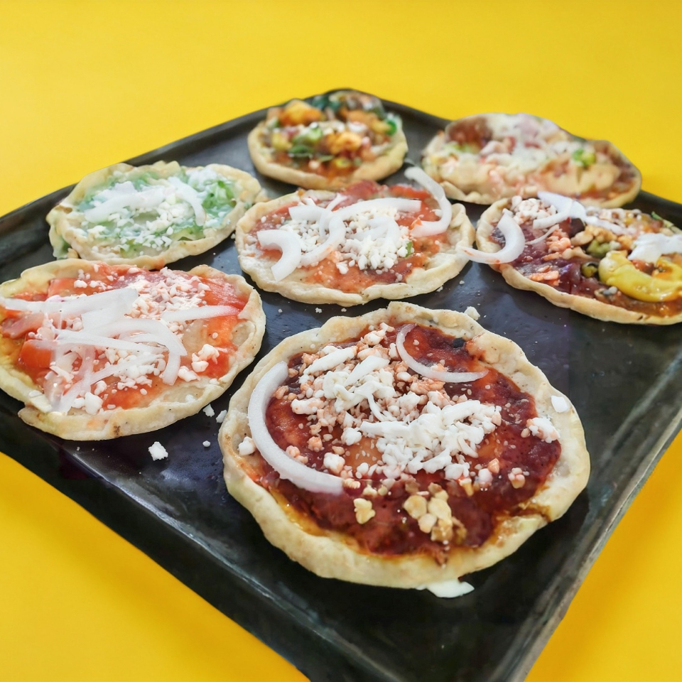 Salsas: tomate, ranchera, verde, habanera, mole, chipotle proteína: longaniza, bistec, chicharrón en salsa, pollo, picadillo, huevo revuelto o estrellado, pibil (a elegir), queso, aguacate, cebolla.