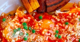 Huevos estrellados (2pz) montados en tortilla y jamón, bañados en salsa ranchera, y acompañados de aguacate y frijoles