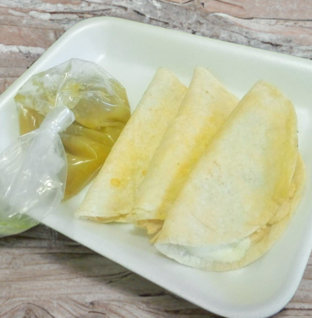 tortilla de maiz quique, rellenas de queso de hebra, pollo, adicionada con salsa pícante