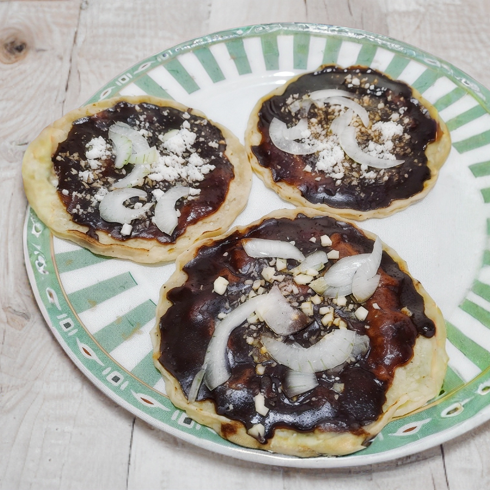 rica picada con bastante salsa y mucho queso, y cebolla