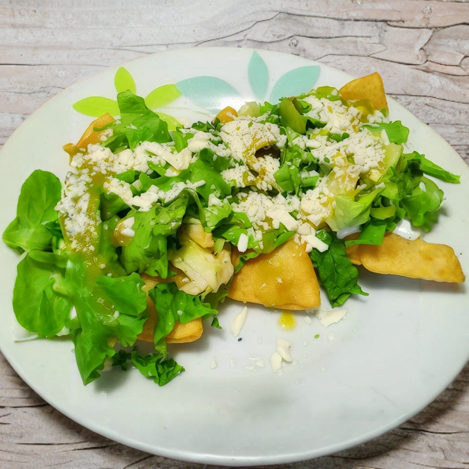 tostada de pollo blanco receta especial de la casa, con lechuga crema y queso, y salsa aparte