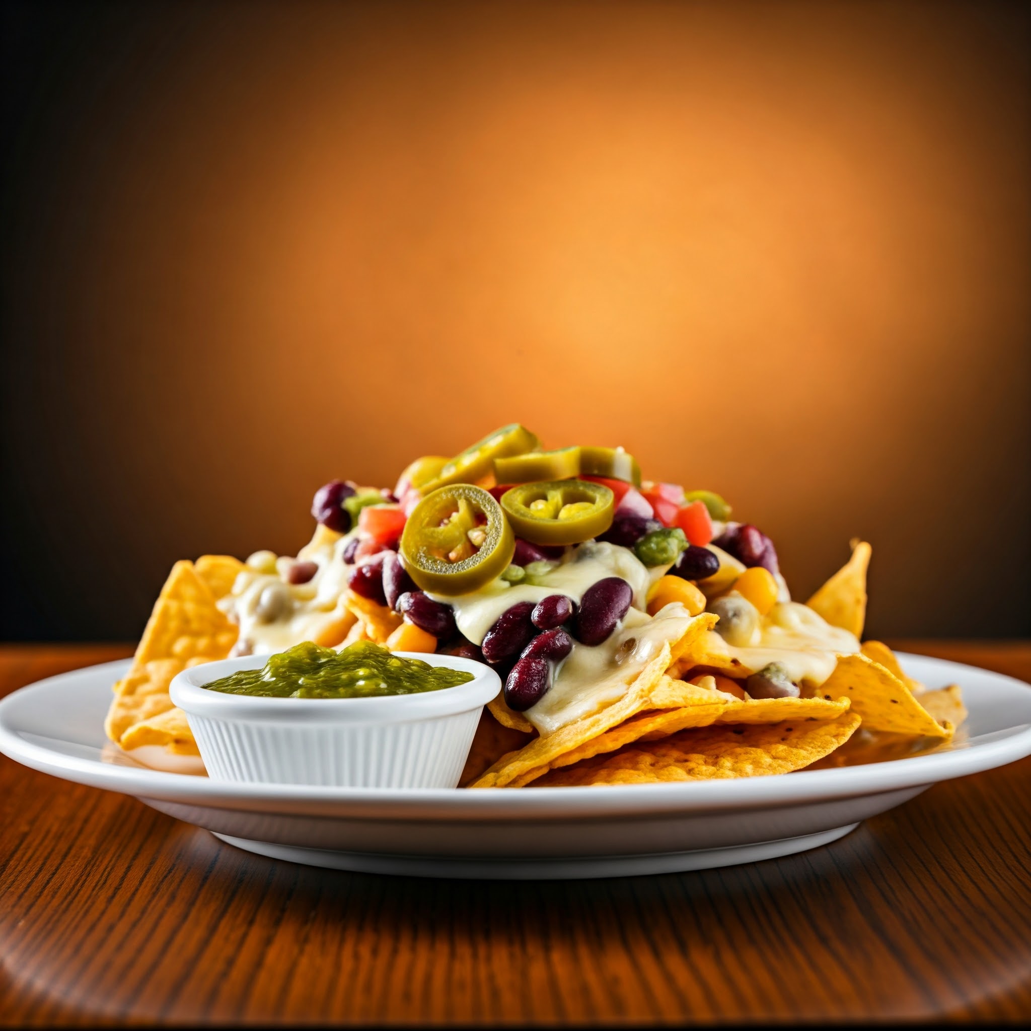 Tortilla nacho con queso, pico de gallo y chiles, acompañado de frijoles y guacamole.