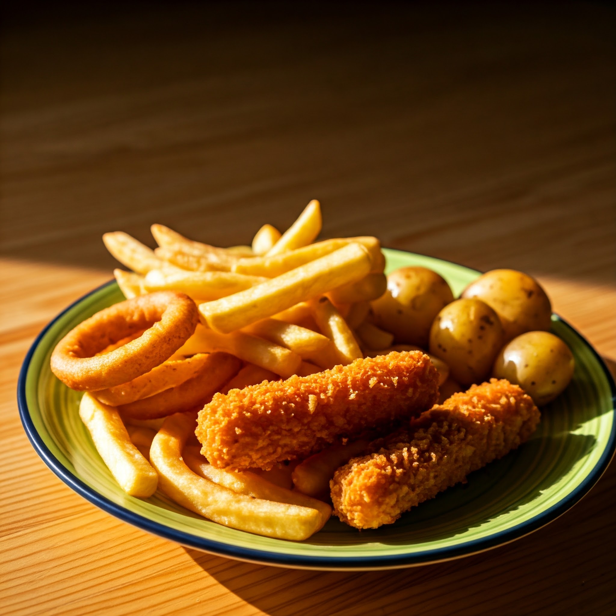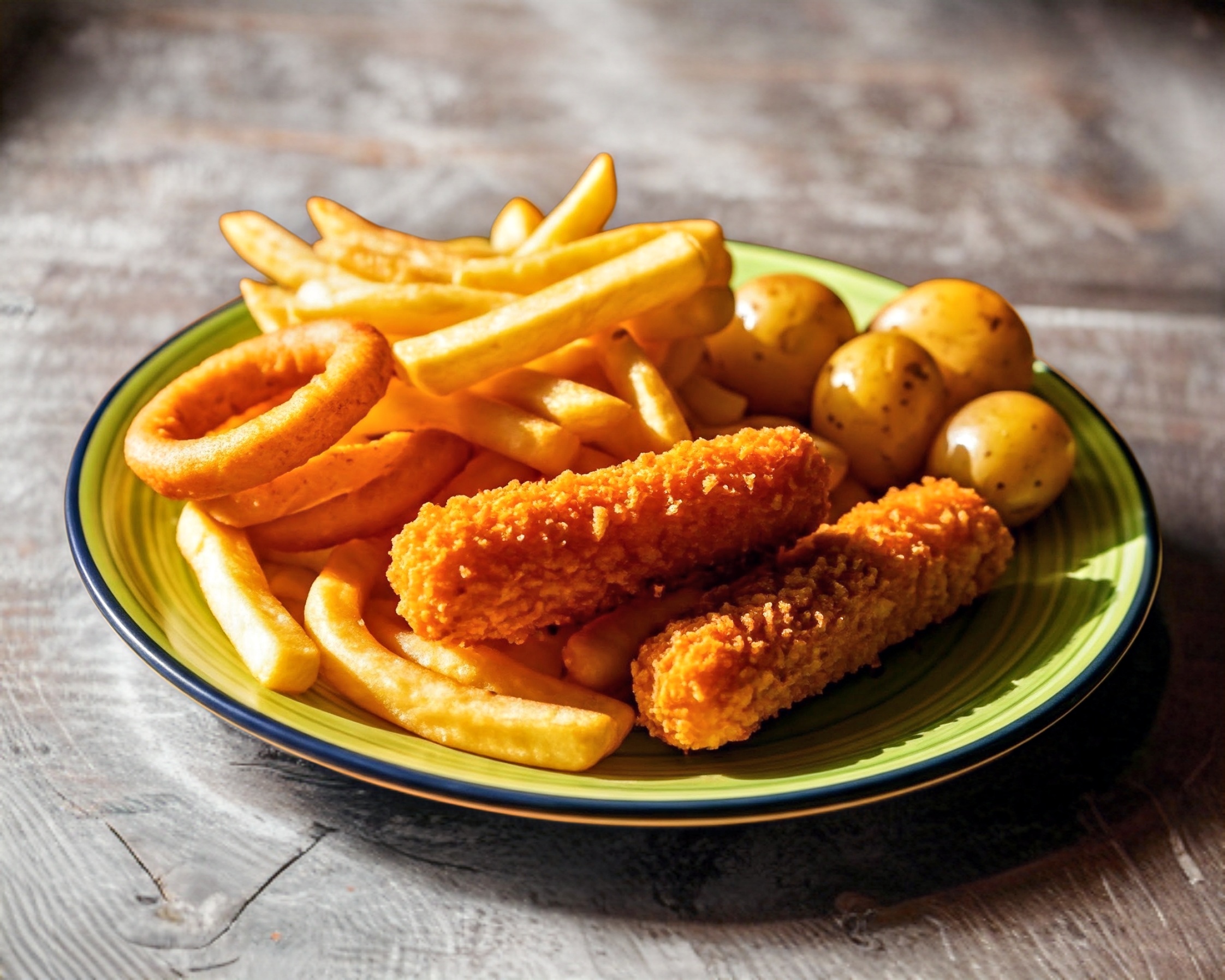 Aros de cebolla, dedos de queso, papas a la francesa y patatas.