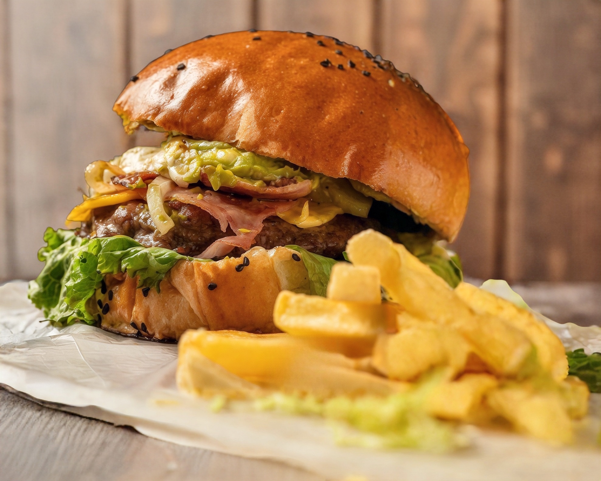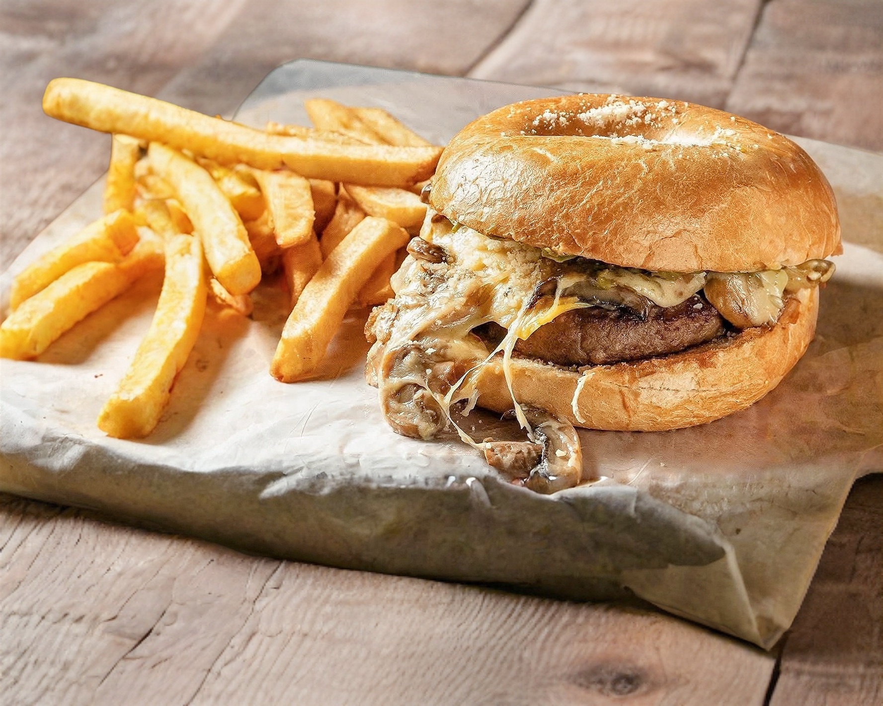 Pan bagel, carne de res, 4 quesos, champiñones y aguacate. (Incluye papas y pan brioche).
