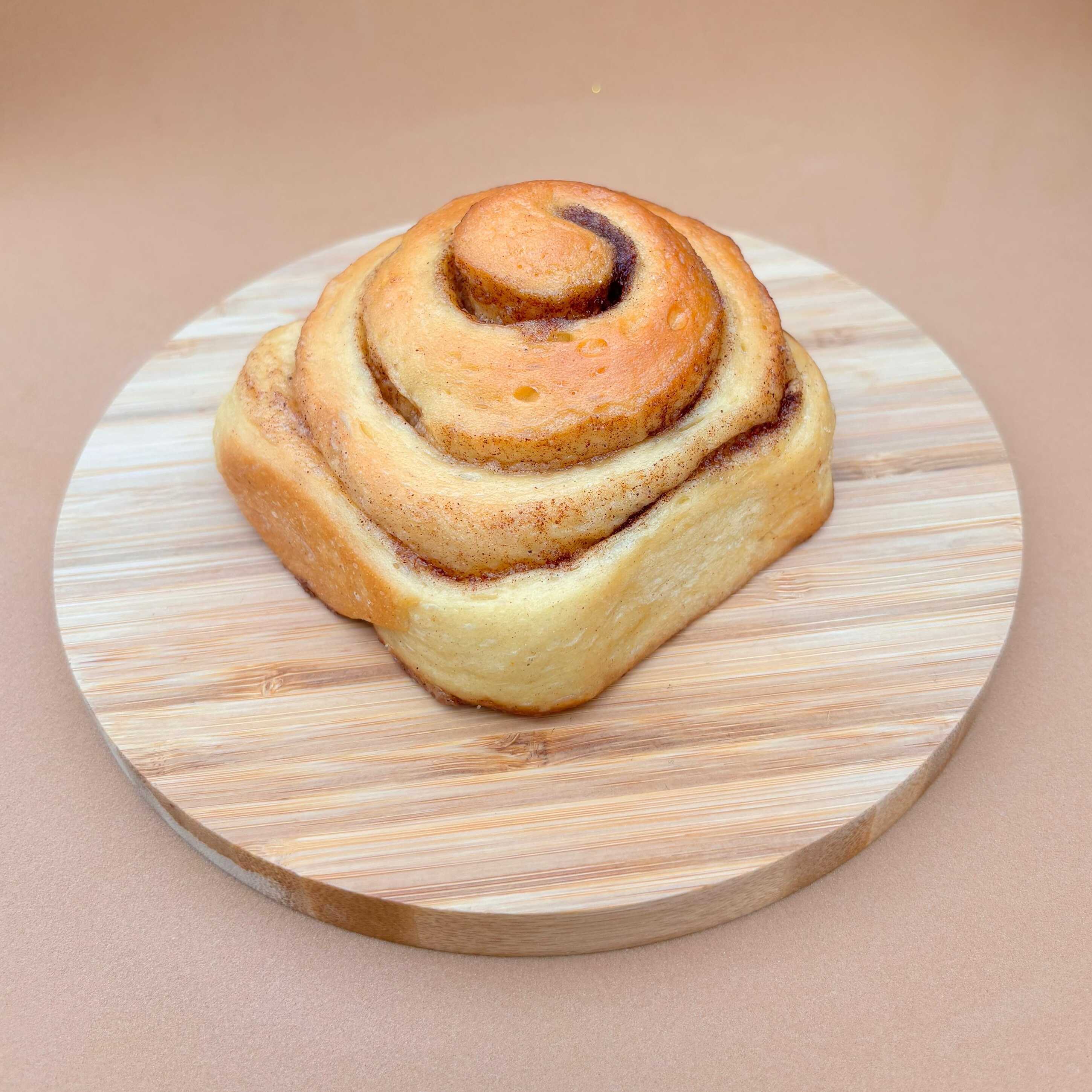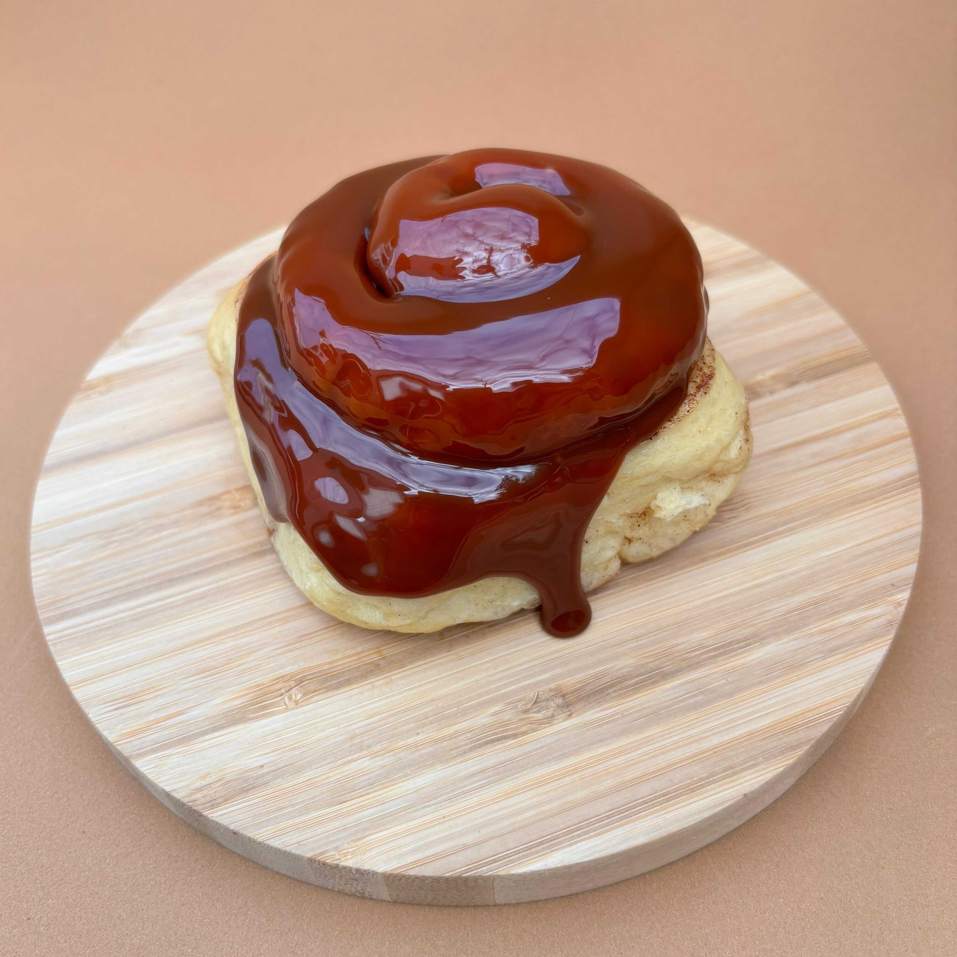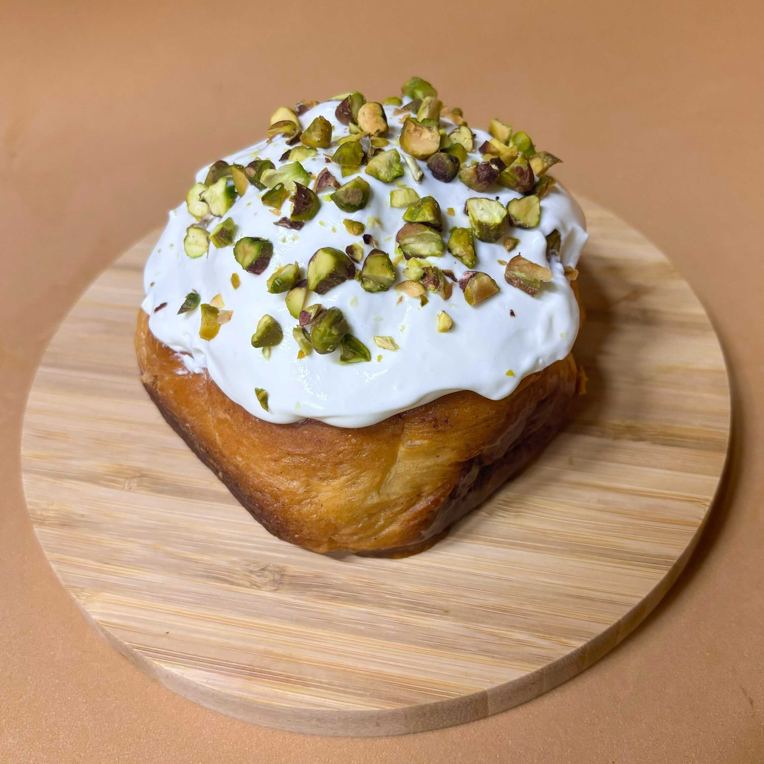 Rol de canela + glaseado + ganache de pistache + trozos de pistache