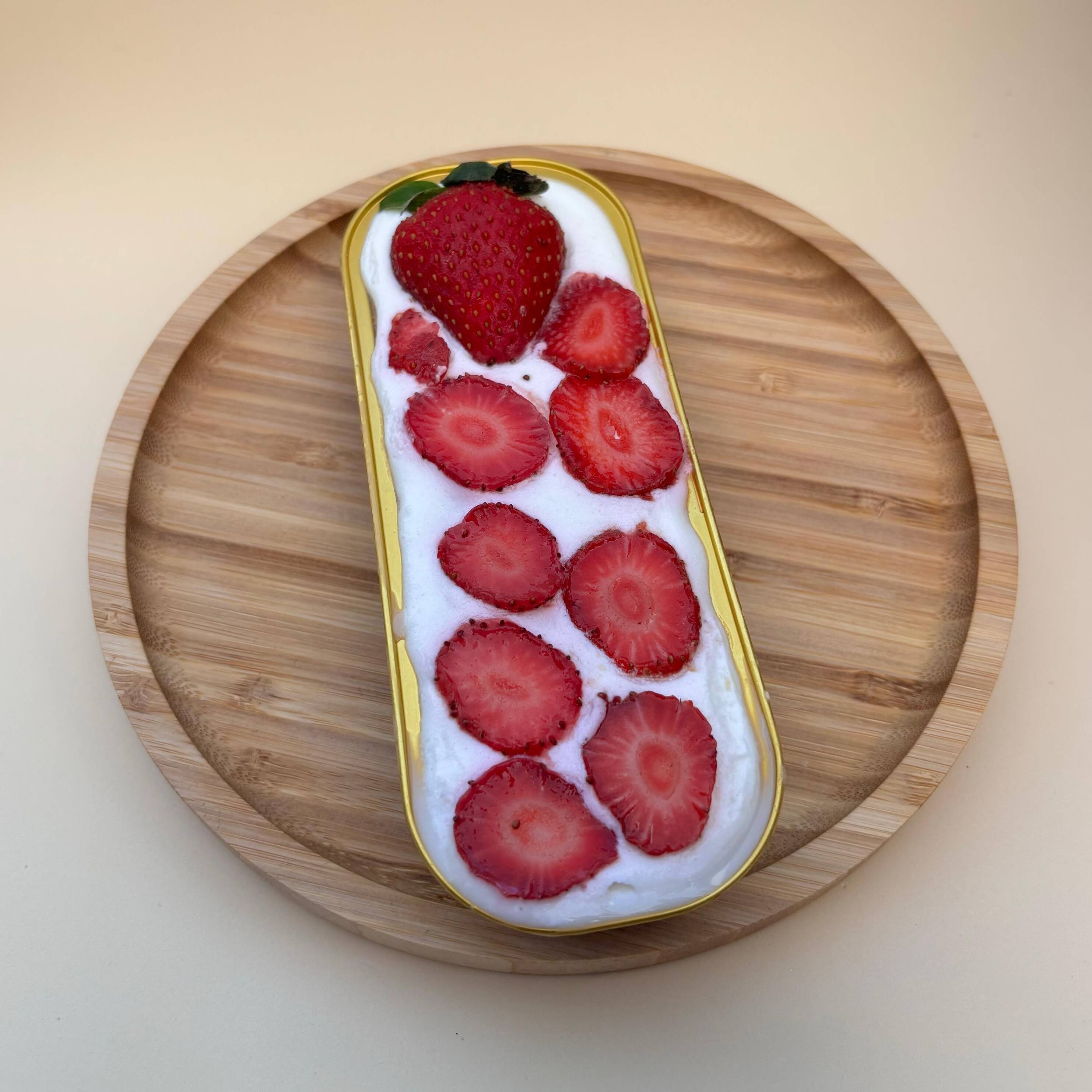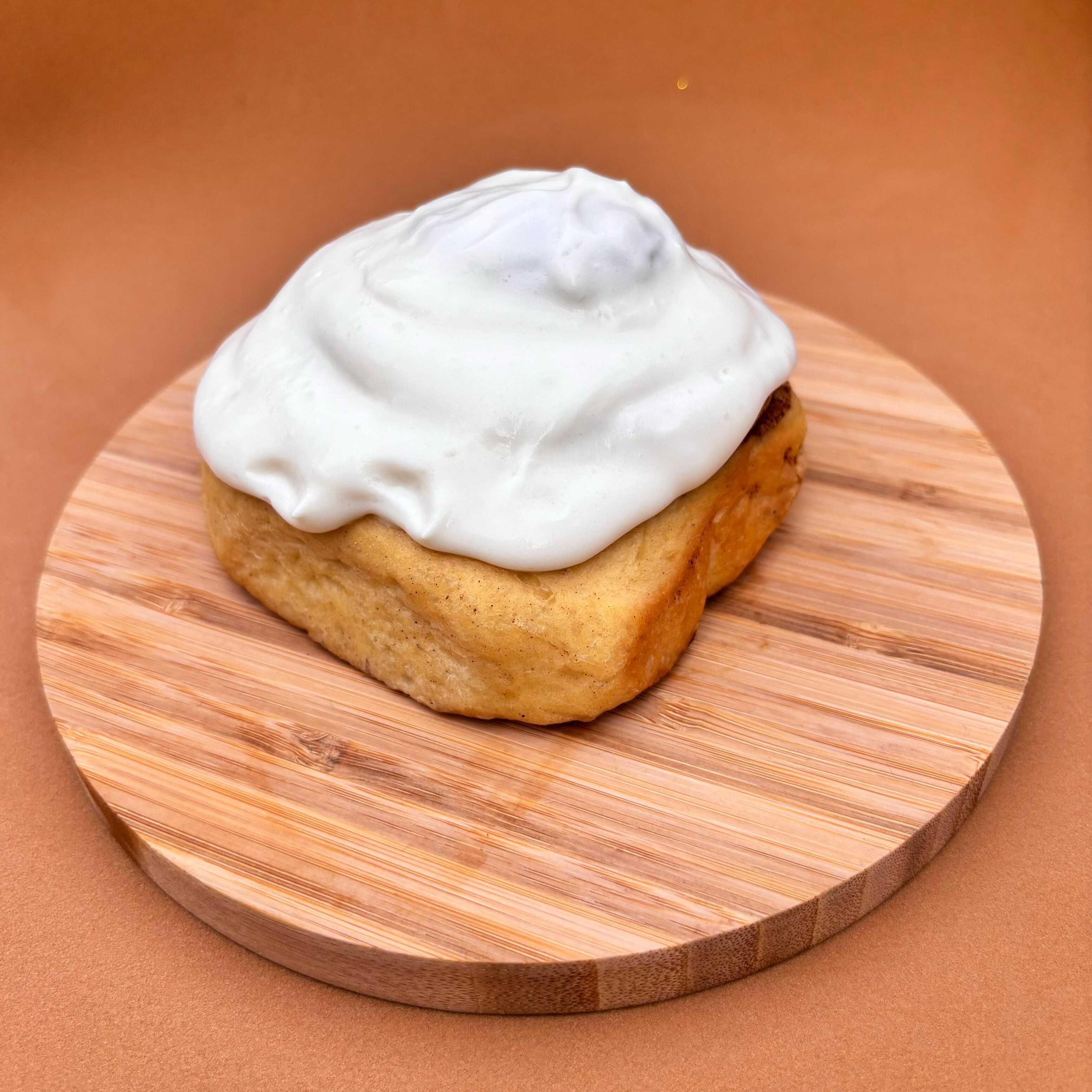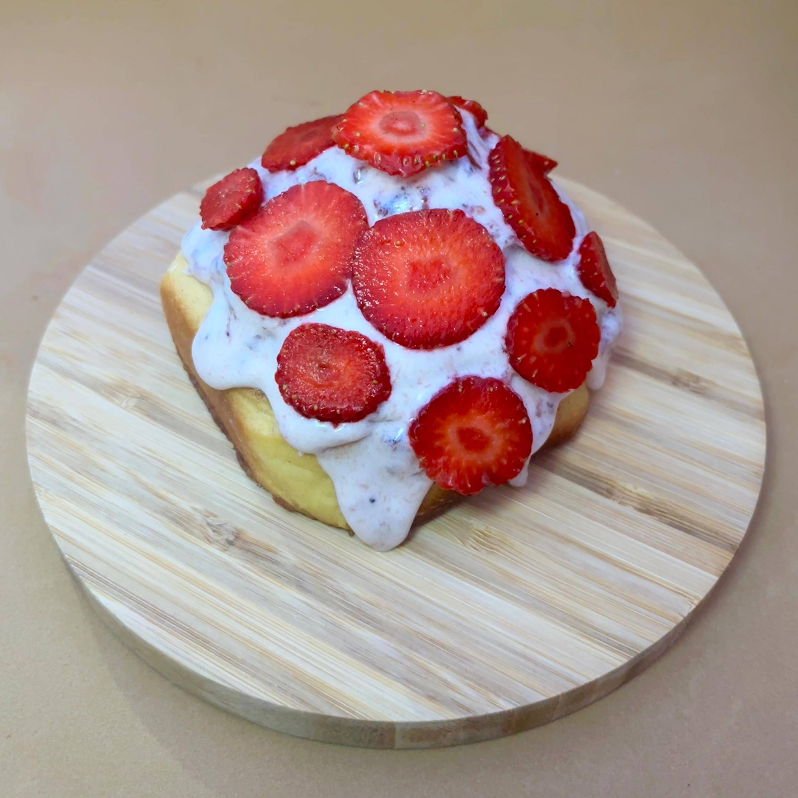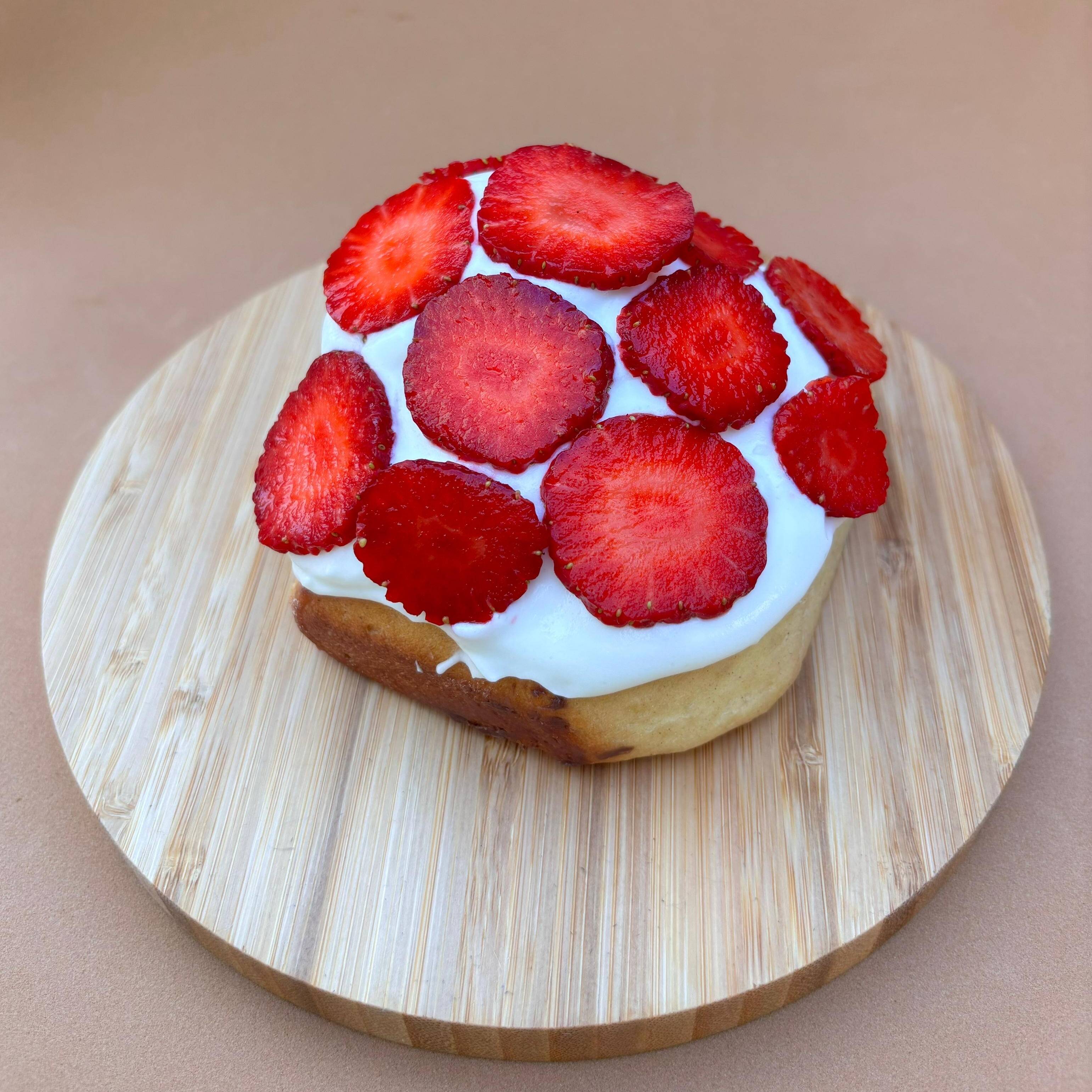 Rol de canela + glaseado + mermelada casera de fresa + trozos de fresa