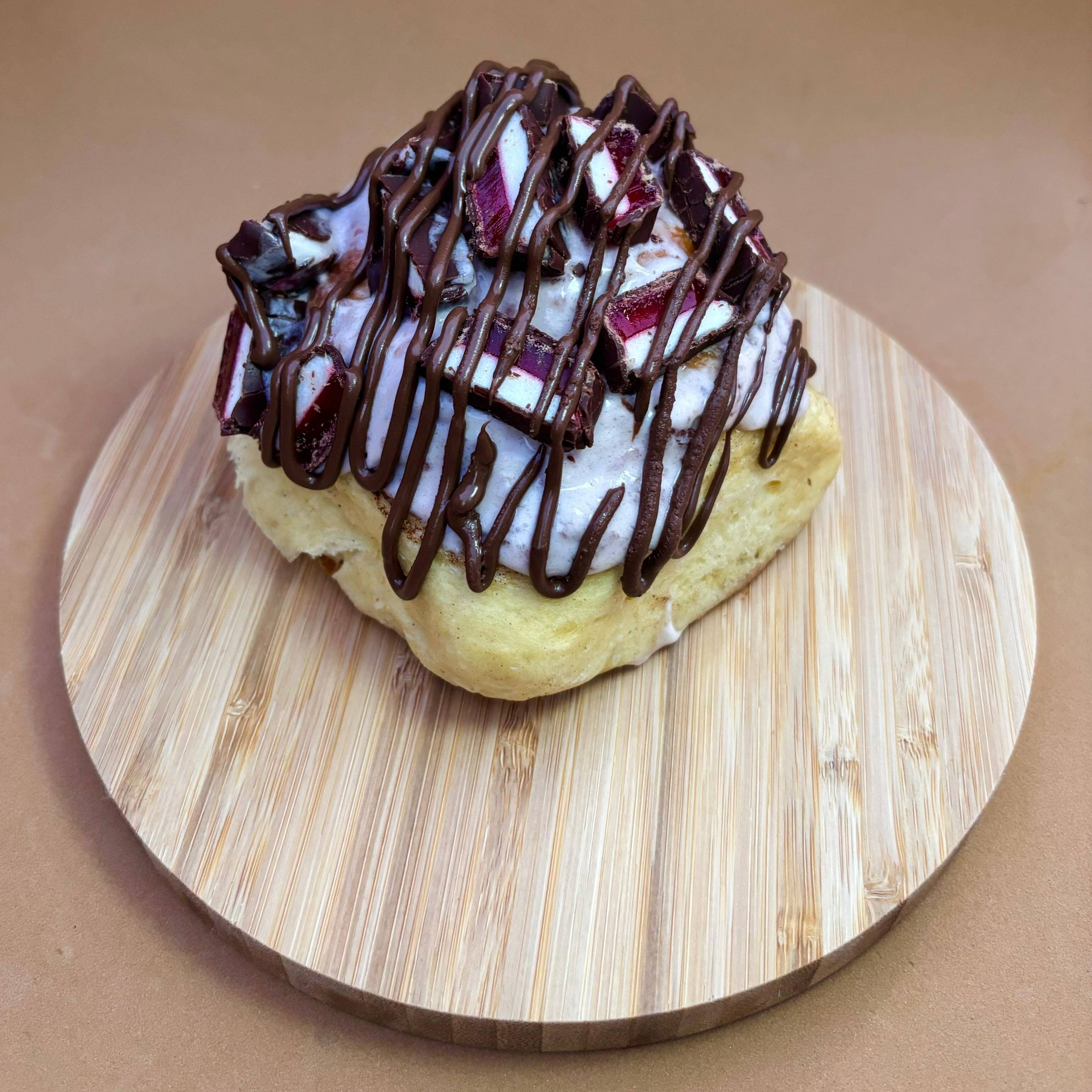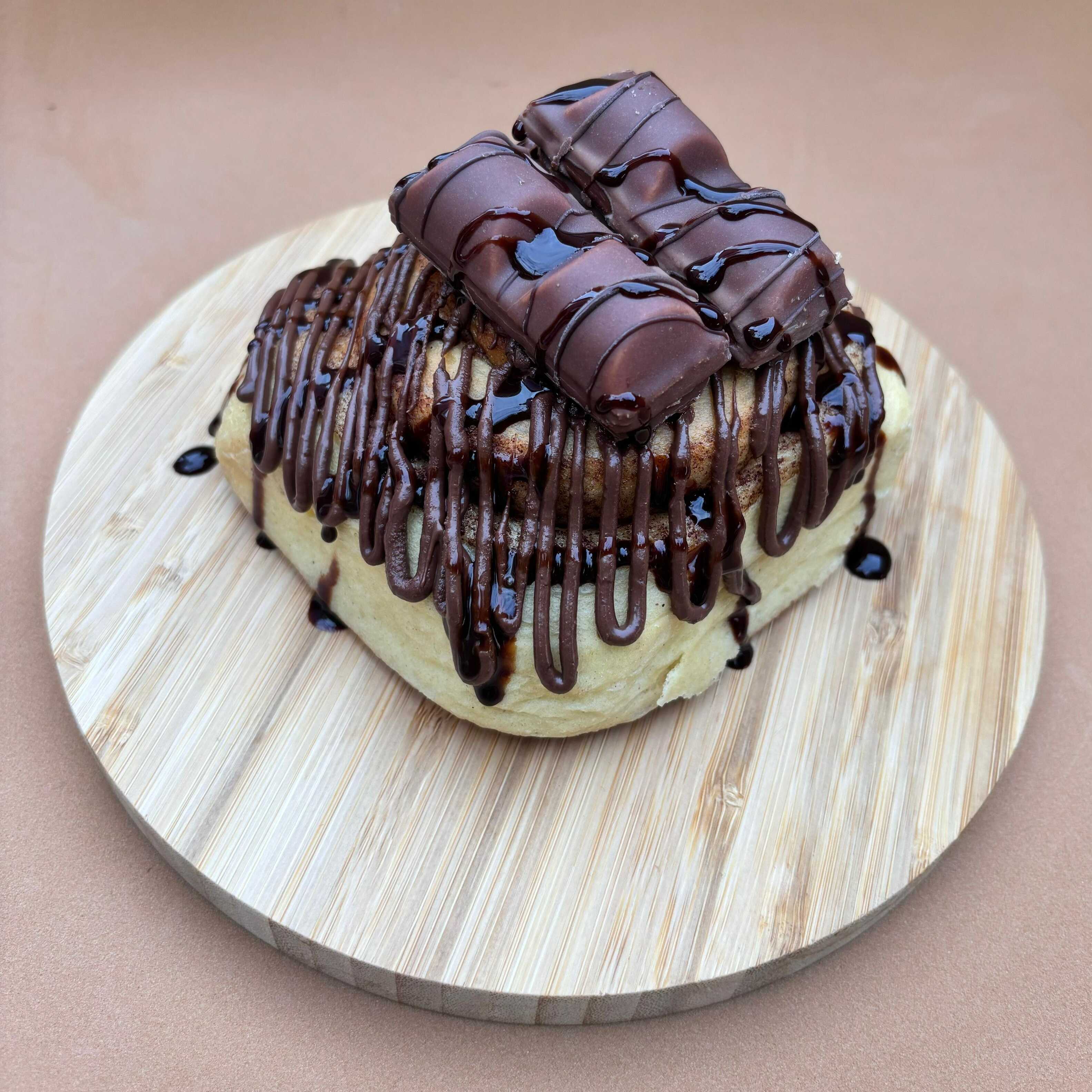 Rol de canela + nutella + trozos de kinder bueno + salsa de chocolate