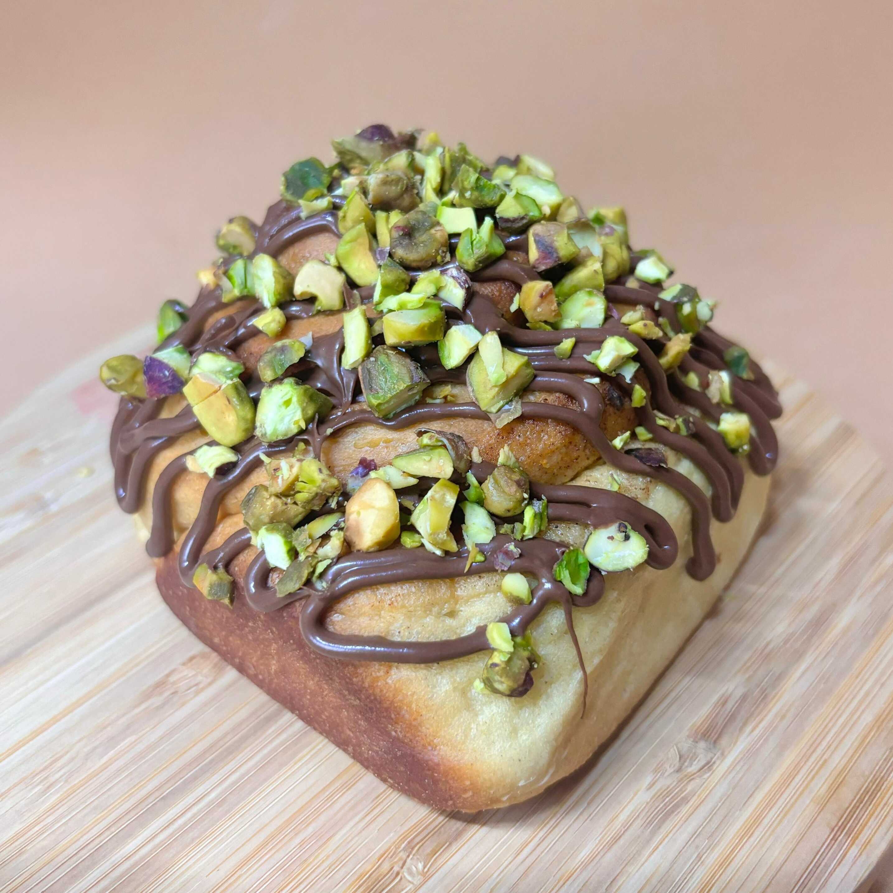 Rol de canela + nutella + ganache de pistache + trozos de pistache.